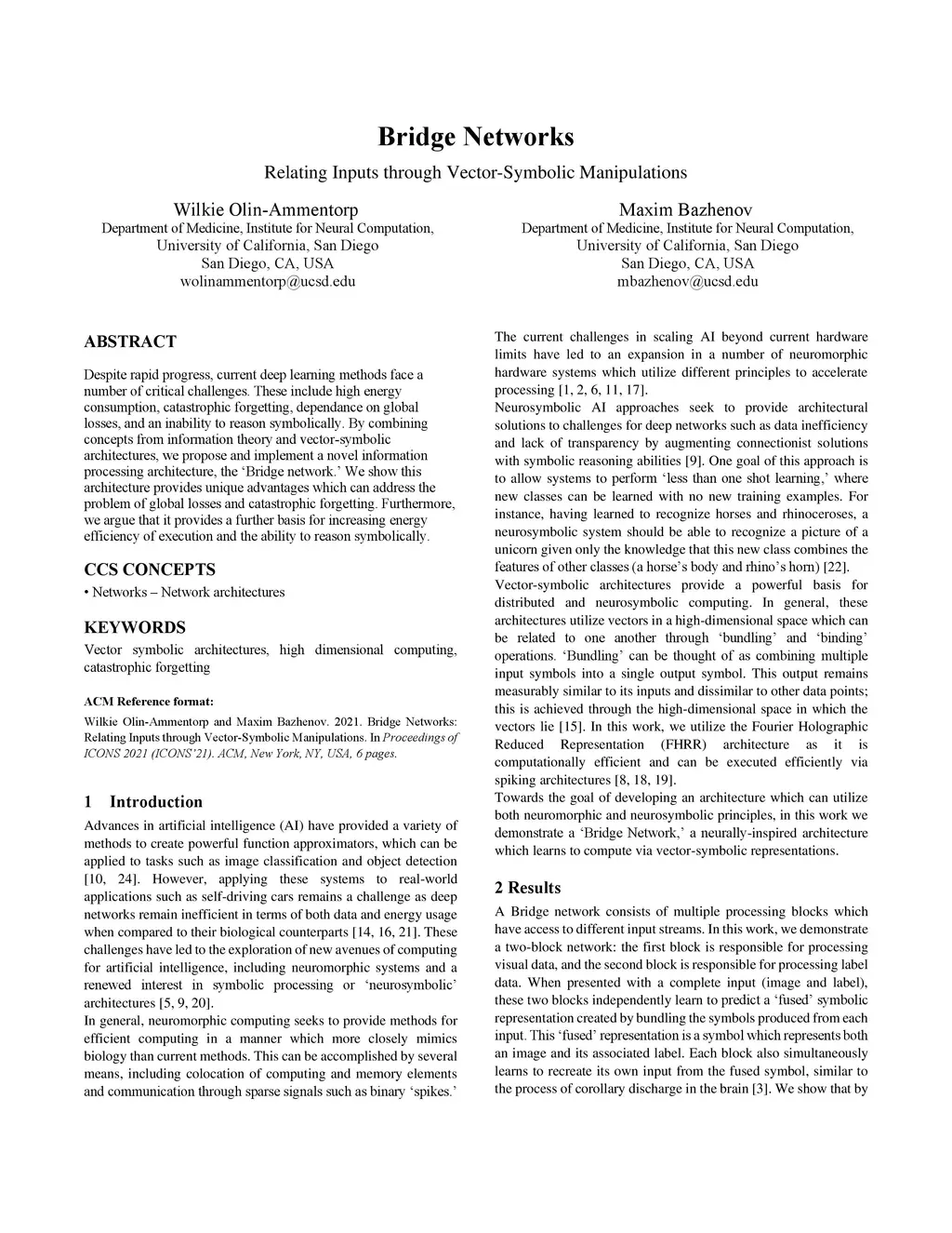 Despite rapid progress, current deep learning methods face a number of critical challenges. These include high energy consumption, catastrophic forgetting, dependance on global losses, and an inability to reason symbolically. By combining concepts from information bottleneck theory and vector-symbolic architectures, we propose and implement a novel information processing architecture, the 'Bridge network.' We show this architecture provides unique advantages which can address the problem of global losses and catastrophic forgetting. Furthermore, we argue that it provides a further basis for increasing energy efficiency of execution and the ability to reason symbolically.