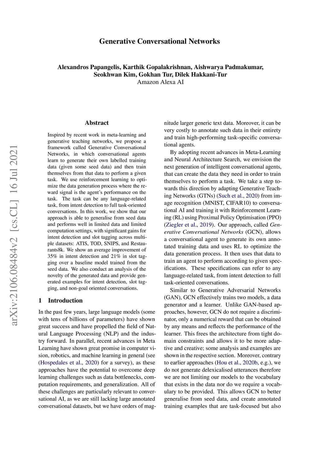 Inspired by recent work in meta-learning and generative teaching networks, we propose a framework called Generative Conversational Networks, in which conversational agents learn to generate their own labelled training data (given some seed data) and then train themselves from that data to perform a given task. We use reinforcement learning to optimize the data generation process where the reward signal is the agent's performance on the task. The task can be any language-related task, from intent detection to full task-oriented conversations. In this work, we show that our approach is able to generalise from seed data and performs well in limited data and limited computation settings, with significant gains for intent detection and slot tagging across multiple datasets: ATIS, TOD, SNIPS, and Restaurants8k. We show an average improvement of 35% in intent detection and 21% in slot tagging over a baseline model trained from the seed data. We also conduct an analysis of the novelty of the generated data and provide generated examples for intent detection, slot tagging, and non-goal oriented conversations.