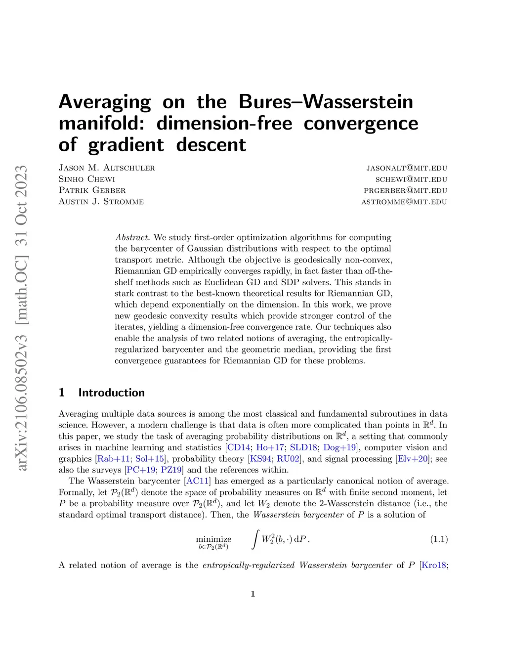 We study first-order optimization algorithms for computing the barycenter of Gaussian distributions with respect to the optimal transport metric. Although the objective is geodesically non-convex, Riemannian GD empirically converges rapidly, in fact faster than off-the-shelf methods such as Euclidean GD and SDP solvers. This stands in stark contrast to the best-known theoretical results for Riemannian GD, which depend exponentially on the dimension. In this work, we prove new geodesic convexity results which provide stronger control of the iterates, yielding a dimension-free convergence rate. Our techniques also enable the analysis of two related notions of averaging, the entropically-regularized barycenter and the geometric median, providing the first convergence guarantees for Riemannian GD for these problems.