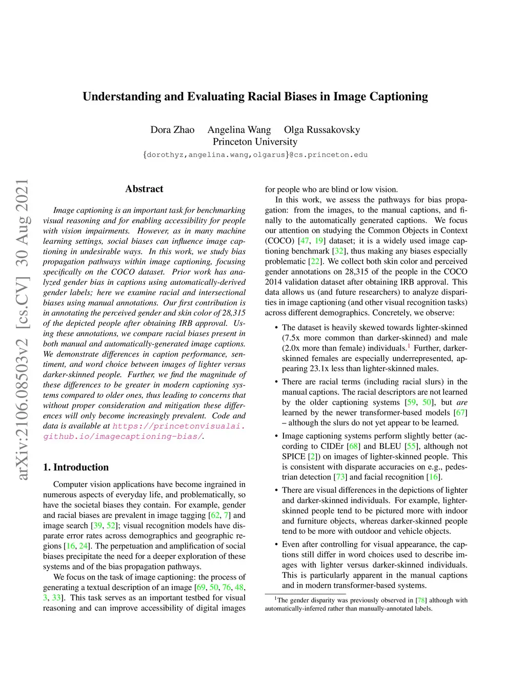 Image captioning is an important task for benchmarking visual reasoning and for enabling accessibility for people with vision impairments. However, as in many machine learning settings, social biases can influence image captioning in undesirable ways. In this work, we study bias propagation pathways within image captioning, focusing specifically on the COCO dataset. Prior work has analyzed gender bias in captions using automatically-derived gender labels; here we examine racial and intersectional biases using manual annotations. Our first contribution is in annotating the perceived gender and skin color of 28,315 of the depicted people after obtaining IRB approval. Using these annotations, we compare racial biases present in both manual and automatically-generated image captions. We demonstrate differences in caption performance, sentiment, and word choice between images of lighter versus darker-skinned people. Further, we find the magnitude of these differences to be greater in modern captioning systems compared to older ones, thus leading to concerns that without proper consideration and mitigation these differences will only become increasingly prevalent. Code and data is available at https://princetonvisualai.github.io/imagecaptioning-bias .