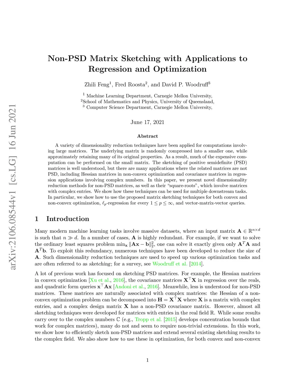 A variety of dimensionality reduction techniques have been applied for computations involving large matrices. The underlying matrix is randomly compressed into a smaller one, while approximately retaining many of its original properties. As a result, much of the expensive computation can be performed on the small matrix. The sketching of positive semidefinite (PSD) matrices is well understood, but there are many applications where the related matrices are not PSD, including Hessian matrices in non-convex optimization and covariance matrices in regression applications involving complex numbers. In this paper, we present novel dimensionality reduction methods for non-PSD matrices, as well as their ``square-roots", which involve matrices with complex entries. We show how these techniques can be used for multiple downstream tasks. In particular, we show how to use the proposed matrix sketching techniques for both convex and non-convex optimization, -regression for every , and vector-matrix-vector queries.