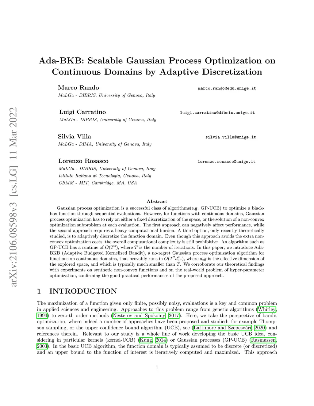 Ada-BKB: Scalable Gaussian Process Optimization on Continuous Domains by