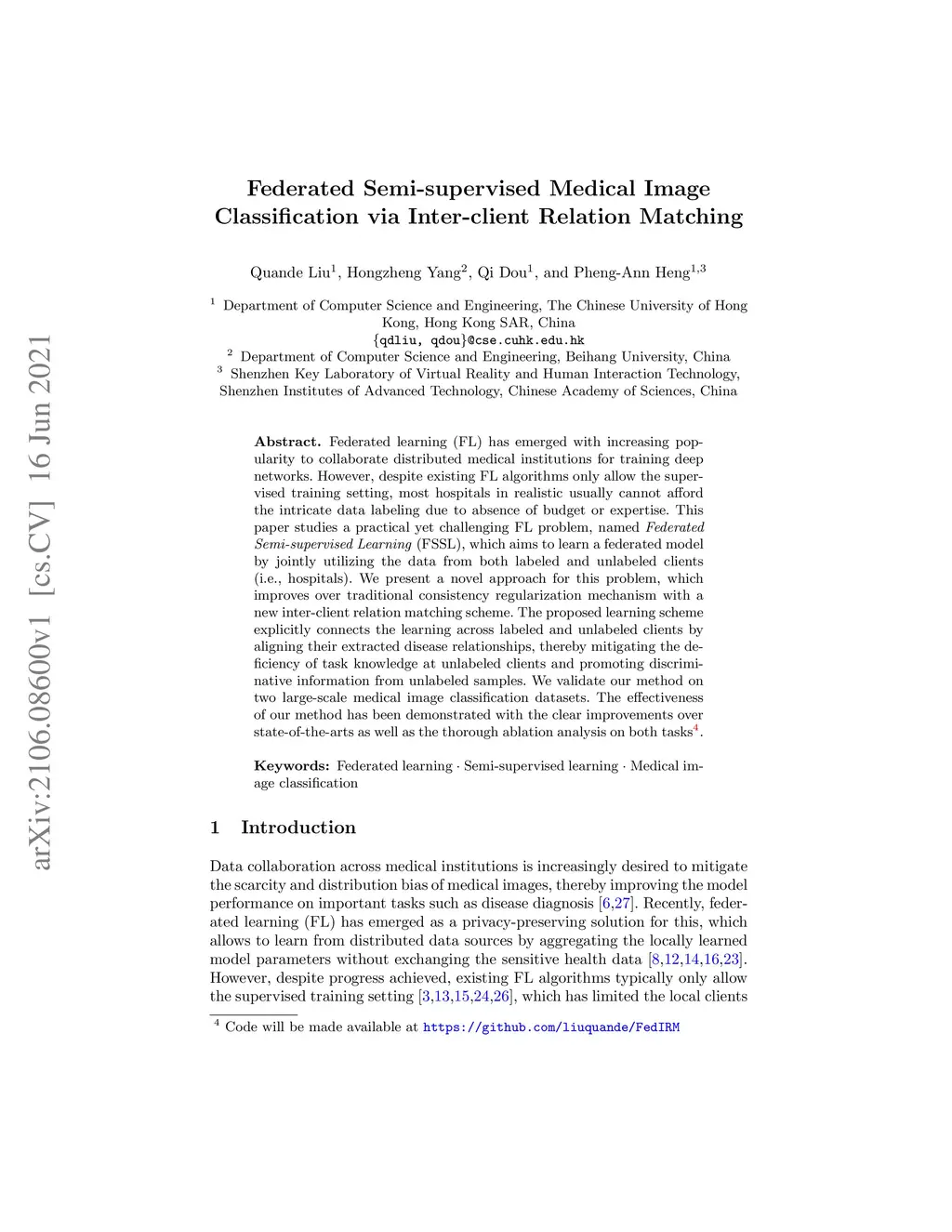 Federated learning (FL) has emerged with increasing popularity to collaborate distributed medical institutions for training deep networks. However, despite existing FL algorithms only allow the supervised training setting, most hospitals in realistic usually cannot afford the intricate data labeling due to absence of budget or expertise. This paper studies a practical yet challenging FL problem, named \textit{Federated Semi-supervised Learning} (FSSL), which aims to learn a federated model by jointly utilizing the data from both labeled and unlabeled clients (i.e., hospitals). We present a novel approach for this problem, which improves over traditional consistency regularization mechanism with a new inter-client relation matching scheme. The proposed learning scheme explicitly connects the learning across labeled and unlabeled clients by aligning their extracted disease relationships, thereby mitigating the deficiency of task knowledge at unlabeled clients and promoting discriminative information from unlabeled samples. We validate our method on two large-scale medical image classification datasets. The effectiveness of our method has been demonstrated with the clear improvements over state-of-the-arts as well as the thorough ablation analysis on both tasks\footnote{Code will be made available at \url{https://github.com/liuquande/FedIRM}}.