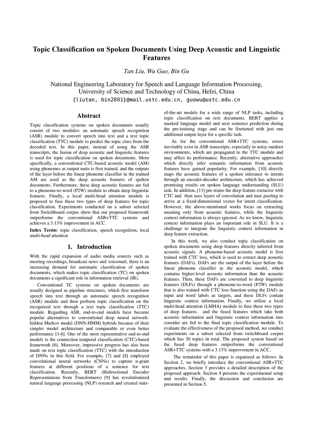 Topic classification systems on spoken documents usually consist of two modules: an automatic speech recognition (ASR) module to convert speech into text and a text topic classification (TTC) module to predict the topic class from the decoded text. In this paper, instead of using the ASR transcripts, the fusion of deep acoustic and linguistic features is used for topic classification on spoken documents. More specifically, a conventional CTC-based acoustic model (AM) using phonemes as output units is first trained, and the outputs of the layer before the linear phoneme classifier in the trained AM are used as the deep acoustic features of spoken documents. Furthermore, these deep acoustic features are fed to a phoneme-to-word (P2W) module to obtain deep linguistic features. Finally, a local multi-head attention module is proposed to fuse these two types of deep features for topic classification. Experiments conducted on a subset selected from Switchboard corpus show that our proposed framework outperforms the conventional ASR+TTC systems and achieves a 3.13% improvement in ACC.