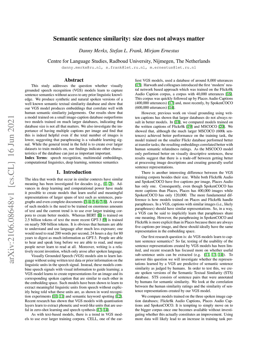 This study addresses the question whether visually grounded speech recognition (VGS) models learn to capture sentence semantics without access to any prior linguistic knowledge. We produce synthetic and natural spoken versions of a well known semantic textual similarity database and show that our VGS model produces embeddings that correlate well with human semantic similarity judgements. Our results show that a model trained on a small image-caption database outperforms two models trained on much larger databases, indicating that database size is not all that matters. We also investigate the importance of having multiple captions per image and find that this is indeed helpful even if the total number of images is lower, suggesting that paraphrasing is a valuable learning signal. While the general trend in the field is to create ever larger datasets to train models on, our findings indicate other characteristics of the database can just as important important.