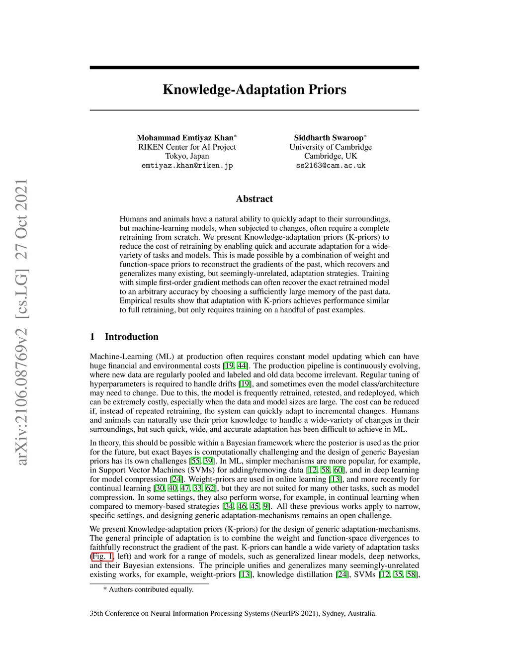 Humans and animals have a natural ability to quickly adapt to their surroundings, but machine-learning models, when subjected to changes, often require a complete retraining from scratch. We present Knowledge-adaptation priors (K-priors) to reduce the cost of retraining by enabling quick and accurate adaptation for a wide-variety of tasks and models. This is made possible by a combination of weight and function-space priors to reconstruct the gradients of the past, which recovers and generalizes many existing, but seemingly-unrelated, adaptation strategies. Training with simple first-order gradient methods can often recover the exact retrained model to an arbitrary accuracy by choosing a sufficiently large memory of the past data. Empirical results show that adaptation with K-priors achieves performance similar to full retraining, but only requires training on a handful of past examples.