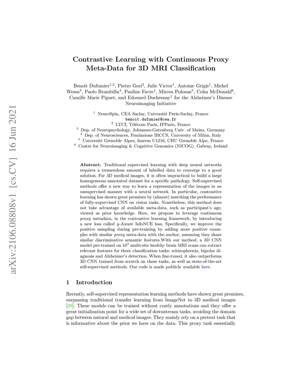 Traditional supervised learning with deep neural networks requires a tremendous amount of labelled data to converge to a good solution. For 3D medical images, it is often impractical to build a large homogeneous annotated dataset for a specific pathology. Self-supervised methods offer a new way to learn a representation of the images in an unsupervised manner with a neural network. In particular, contrastive learning has shown great promises by (almost) matching the performance of fully-supervised CNN on vision tasks. Nonetheless, this method does not take advantage of available meta-data, such as participant's age, viewed as prior knowledge. Here, we propose to leverage continuous proxy metadata, in the contrastive learning framework, by introducing a new loss called y-Aware InfoNCE loss. Specifically, we improve the positive sampling during pre-training by adding more positive examples with similar proxy meta-data with the anchor, assuming they share similar discriminative semantic features.With our method, a 3D CNN model pre-trained on multi-site healthy brain MRI scans can extract relevant features for three classification tasks: schizophrenia, bipolar diagnosis and Alzheimer's detection. When fine-tuned, it also outperforms 3D CNN trained from scratch on these tasks, as well as state-of-the-art self-supervised methods. Our code is made publicly available here.