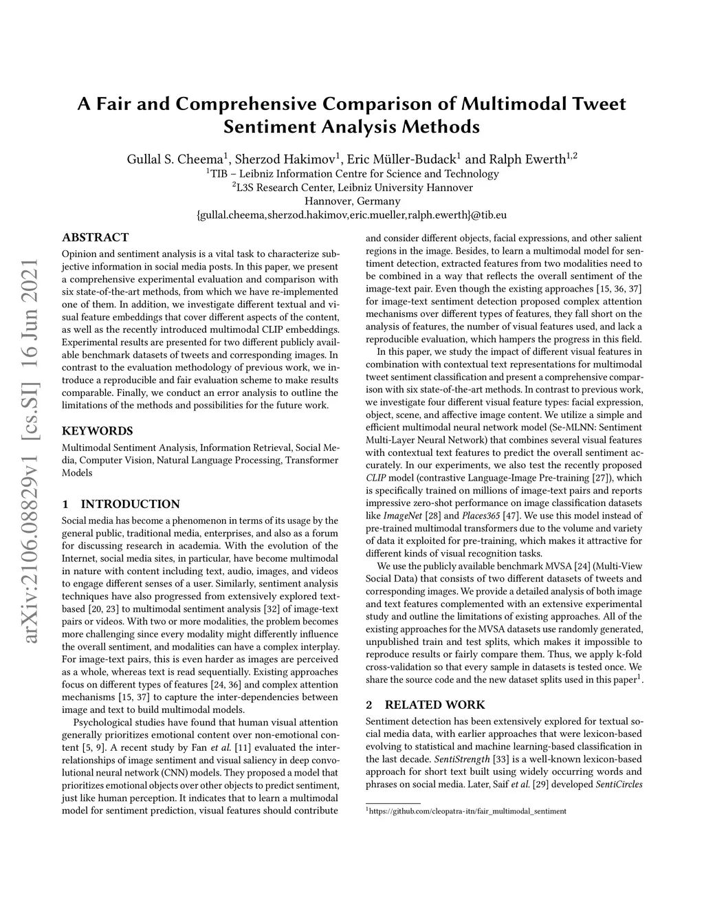 Opinion and sentiment analysis is a vital task to characterize subjective information in social media posts. In this paper, we present a comprehensive experimental evaluation and comparison with six state-of-the-art methods, from which we have re-implemented one of them. In addition, we investigate different textual and visual feature embeddings that cover different aspects of the content, as well as the recently introduced multimodal CLIP embeddings. Experimental results are presented for two different publicly available benchmark datasets of tweets and corresponding images. In contrast to the evaluation methodology of previous work, we introduce a reproducible and fair evaluation scheme to make results comparable. Finally, we conduct an error analysis to outline the limitations of the methods and possibilities for the future work.