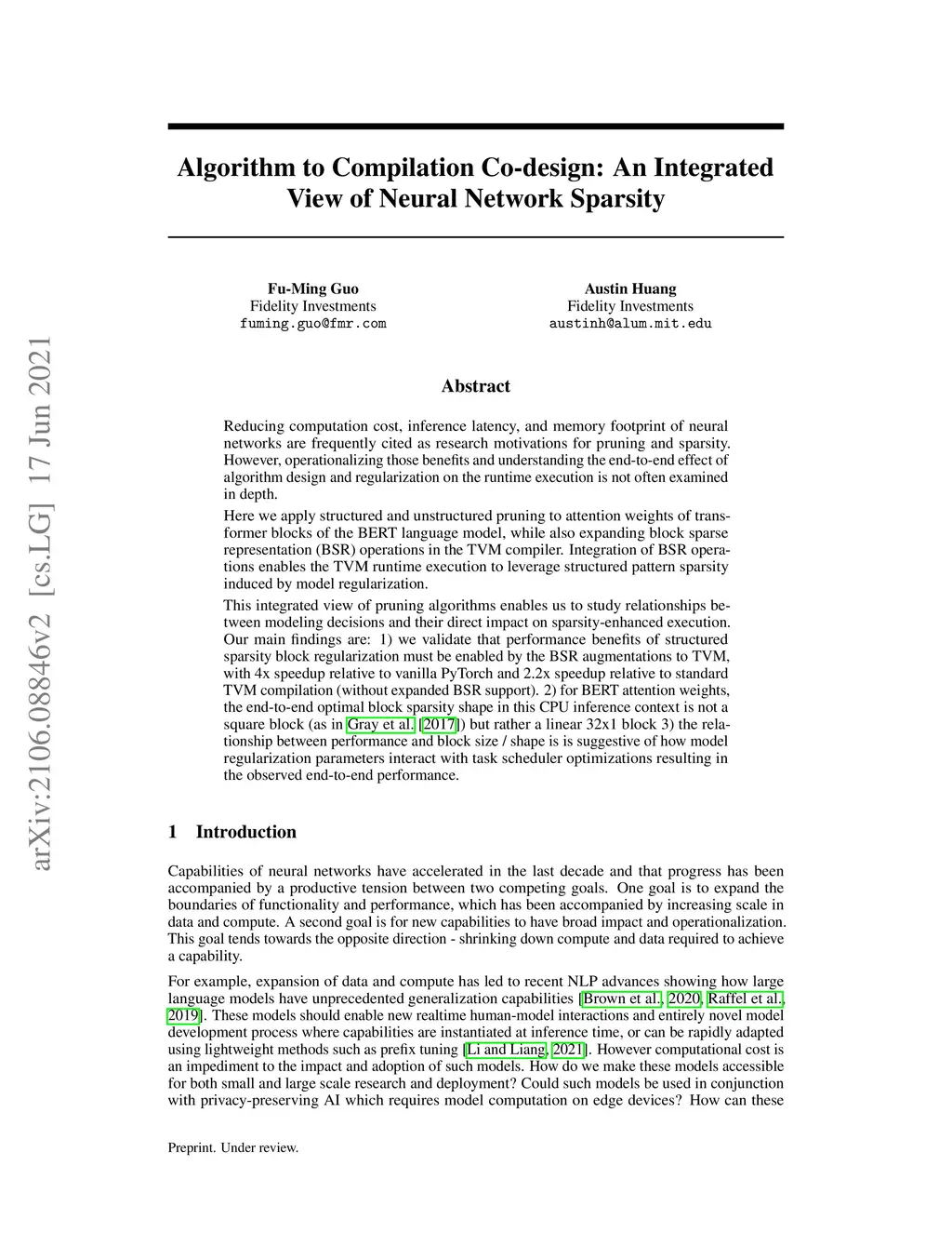 Reducing computation cost, inference latency, and memory footprint of neural networks are frequently cited as research motivations for pruning and sparsity. However, operationalizing those benefits and understanding the end-to-end effect of algorithm design and regularization on the runtime execution is not often examined in depth. Here we apply structured and unstructured pruning to attention weights of transformer blocks of the BERT language model, while also expanding block sparse representation (BSR) operations in the TVM compiler. Integration of BSR operations enables the TVM runtime execution to leverage structured pattern sparsity induced by model regularization. This integrated view of pruning algorithms enables us to study relationships between modeling decisions and their direct impact on sparsity-enhanced execution. Our main findings are: 1) we validate that performance benefits of structured sparsity block regularization must be enabled by the BSR augmentations to TVM, with 4x speedup relative to vanilla PyTorch and 2.2x speedup relative to standard TVM compilation (without expanded BSR support). 2) for BERT attention weights, the end-to-end optimal block sparsity shape in this CPU inference context is not a square block (as in \cite{gray2017gpu}) but rather a linear 32x1 block 3) the relationship between performance and block size / shape is is suggestive of how model regularization parameters interact with task scheduler optimizations resulting in the observed end-to-end performance.