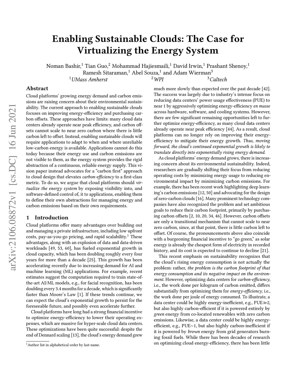 Cloud platforms' growing energy demand and carbon emissions are raising concern about their environmental sustainability. The current approach to enabling sustainable clouds focuses on improving energy-efficiency and purchasing carbon offsets. These approaches have limits: many cloud data centers already operate near peak efficiency, and carbon offsets cannot scale to near zero carbon where there is little carbon left to offset. Instead, enabling sustainable clouds will require applications to adapt to when and where unreliable low-carbon energy is available. Applications cannot do this today because their energy use and carbon emissions are not visible to them, as the energy system provides the rigid abstraction of a continuous, reliable energy supply. This vision paper instead advocates for a ``carbon first'' approach to cloud design that elevates carbon-efficiency to a first-class metric. To do so, we argue that cloud platforms should virtualize the energy system by exposing visibility into, and software-defined control of, it to applications, enabling them to define their own abstractions for managing energy and carbon emissions based on their own requirements.