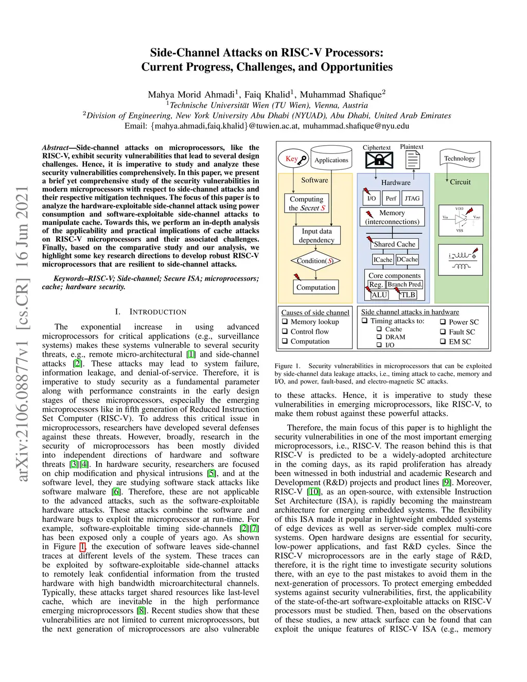 Side-channel attacks on microprocessors, like the RISC-V, exhibit security vulnerabilities that lead to several design challenges. Hence, it is imperative to study and analyze these security vulnerabilities comprehensively. In this paper, we present a brief yet comprehensive study of the security vulnerabilities in modern microprocessors with respect to side-channel attacks and their respective mitigation techniques. The focus of this paper is to analyze the hardware-exploitable side-channel attack using power consumption and software-exploitable side-channel attacks to manipulate cache. Towards this, we perform an in-depth analysis of the applicability and practical implications of cache attacks on RISC-V microprocessors and their associated challenges. Finally, based on the comparative study and our analysis, we highlight some key research directions to develop robust RISC-V microprocessors that are resilient to side-channel attacks.