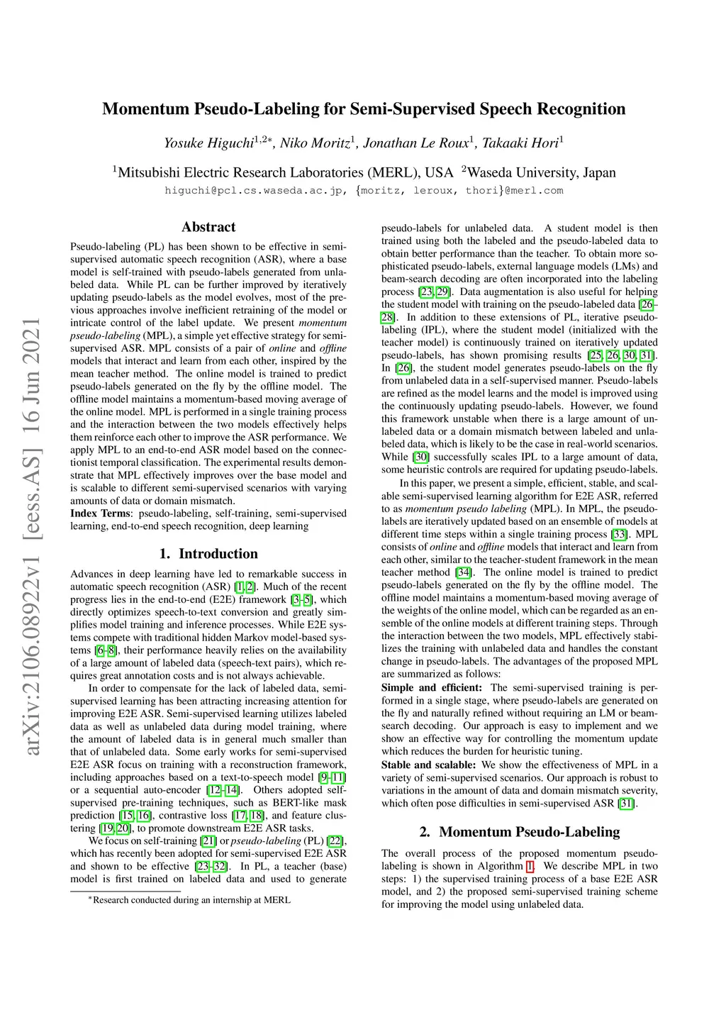 Momentum Pseudo-Labeling for Semi-Supervised Speech Recognition