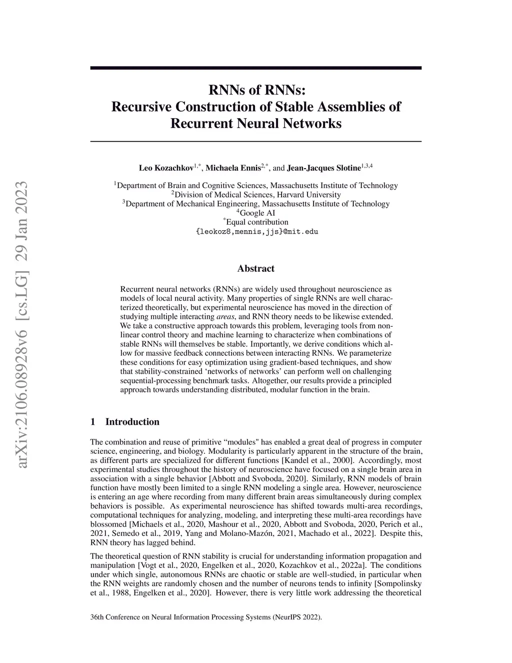Advanced applications of modern machine learning will likely involve combinations of trained networks, as are already used in spectacular systems such as DeepMind's AlphaGo. Recursively building such combinations in an effective and stable fashion while also allowing for continual refinement of the individual networks - as nature does for biological networks - will require new analysis tools. This paper takes a step in this direction by establishing contraction properties of broad classes of nonlinear recurrent networks and neural ODEs, and showing how these quantified properties allow in turn to recursively construct stable networks of networks in a systematic fashion. The results can also be used to stably combine recurrent networks and physical systems with quantified contraction properties. Similarly, they may be applied to modular computational models of cognition. We perform experiments with these combined networks on benchmark sequential tasks (e.g permuted sequential MNIST) to demonstrate their capacity for processing information across a long timescale in a provably stable manner.