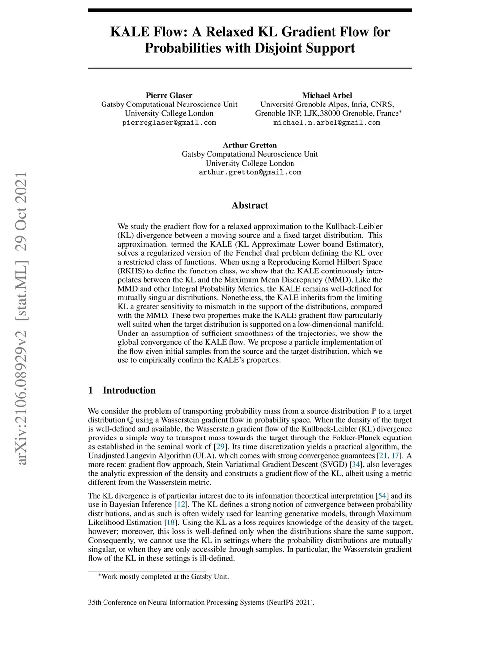 We study the gradient flow for a relaxed approximation to the Kullback-Leibler (KL) divergence between a moving source and a fixed target distribution. This approximation, termed the KALE (KL approximate lower-bound estimator), solves a regularized version of the Fenchel dual problem defining the KL over a restricted class of functions. When using a Reproducing Kernel Hilbert Space (RKHS) to define the function class, we show that the KALE continuously interpolates between the KL and the Maximum Mean Discrepancy (MMD). Like the MMD and other Integral Probability Metrics, the KALE remains well defined for mutually singular distributions. Nonetheless, the KALE inherits from the limiting KL a greater sensitivity to mismatch in the support of the distributions, compared with the MMD. These two properties make the KALE gradient flow particularly well suited when the target distribution is supported on a low-dimensional manifold. Under an assumption of sufficient smoothness of the trajectories, we show the global convergence of the KALE flow. We propose a particle implementation of the flow given initial samples from the source and the target distribution, which we use to empirically confirm the KALE's properties.