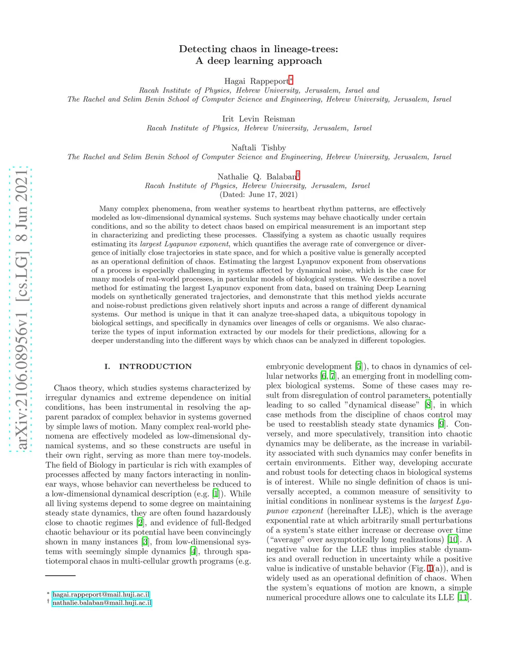 Many complex phenomena, from weather systems to heartbeat rhythm patterns, are effectively modeled as low-dimensional dynamical systems. Such systems may behave chaotically under certain conditions, and so the ability to detect chaos based on empirical measurement is an important step in characterizing and predicting these processes. Classifying a system as chaotic usually requires estimating its largest Lyapunov exponent, which quantifies the average rate of convergence or divergence of initially close trajectories in state space, and for which a positive value is generally accepted as an operational definition of chaos. Estimating the largest Lyapunov exponent from observations of a process is especially challenging in systems affected by dynamical noise, which is the case for many models of real-world processes, in particular models of biological systems. We describe a novel method for estimating the largest Lyapunov exponent from data, based on training Deep Learning models on synthetically generated trajectories, and demonstrate that this method yields accurate and noise-robust predictions given relatively short inputs and across a range of different dynamical systems. Our method is unique in that it can analyze tree-shaped data, a ubiquitous topology in biological settings, and specifically in dynamics over lineages of cells or organisms. We also characterize the types of input information extracted by our models for their predictions, allowing for a deeper understanding into the different ways by which chaos can be analyzed in different topologies.