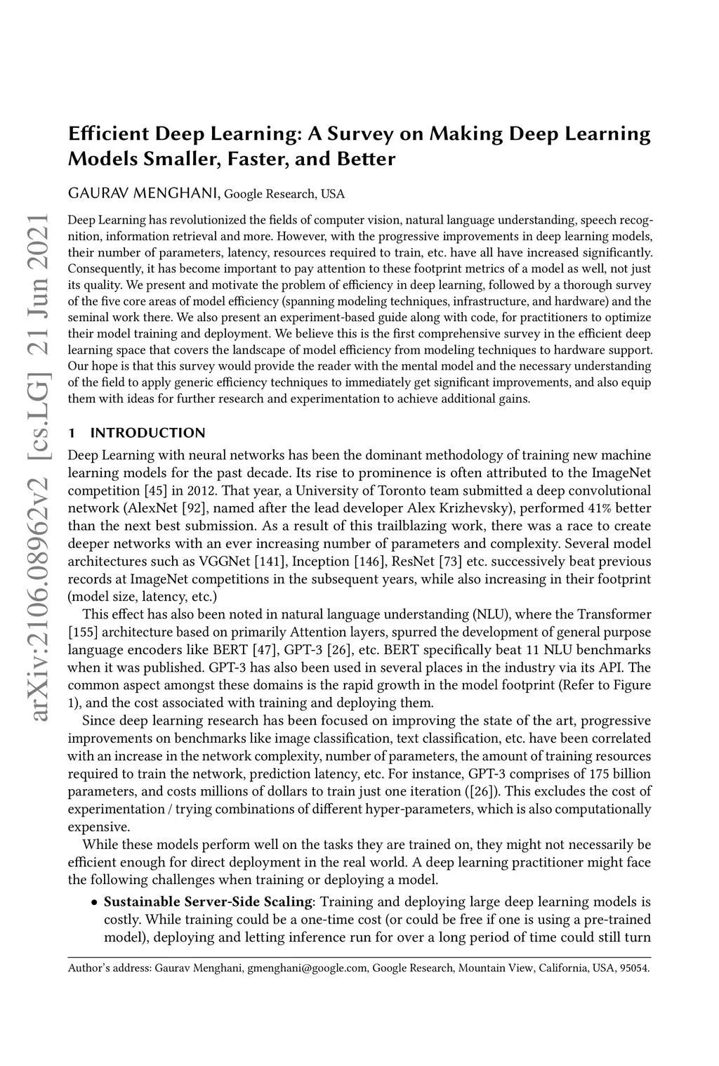 Deep Learning has revolutionized the fields of computer vision, natural language understanding, speech recognition, information retrieval and more. However, with the progressive improvements in deep learning models, their number of parameters, latency, resources required to train, etc. have all have increased significantly. Consequently, it has become important to pay attention to these footprint metrics of a model as well, not just its quality. We present and motivate the problem of efficiency in deep learning, followed by a thorough survey of the five core areas of model efficiency (spanning modeling techniques, infrastructure, and hardware) and the seminal work there. We also present an experiment-based guide along with code, for practitioners to optimize their model training and deployment. We believe this is the first comprehensive survey in the efficient deep learning space that covers the landscape of model efficiency from modeling techniques to hardware support. Our hope is that this survey would provide the reader with the mental model and the necessary understanding of the field to apply generic efficiency techniques to immediately get significant improvements, and also equip them with ideas for further research and experimentation to achieve additional gains.