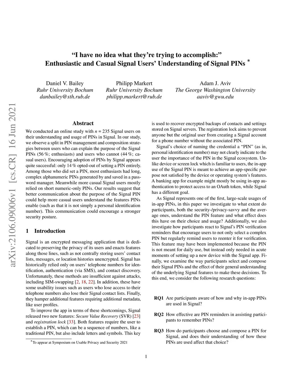 We conducted an online study with Signal users on their understanding and usage of PINs in Signal. In our study, we observe a split in PIN management and composition strategies between users who can explain the purpose of the Signal PINs (56%; enthusiasts) and users who cannot (44%; casual users). Encouraging adoption of PINs by Signal appears quite successful: only 14% opted-out of setting a PIN entirely. Among those who did set a PIN, most enthusiasts had long, complex alphanumeric PINs generated by and saved in a password manager. Meanwhile more casual Signal users mostly relied on short numeric-only PINs. Our results suggest that better communication about the purpose of the Signal PIN could help more casual users understand the features PINs enable (such as that it is not simply a personal identification number). This communication could encourage a stronger security posture.