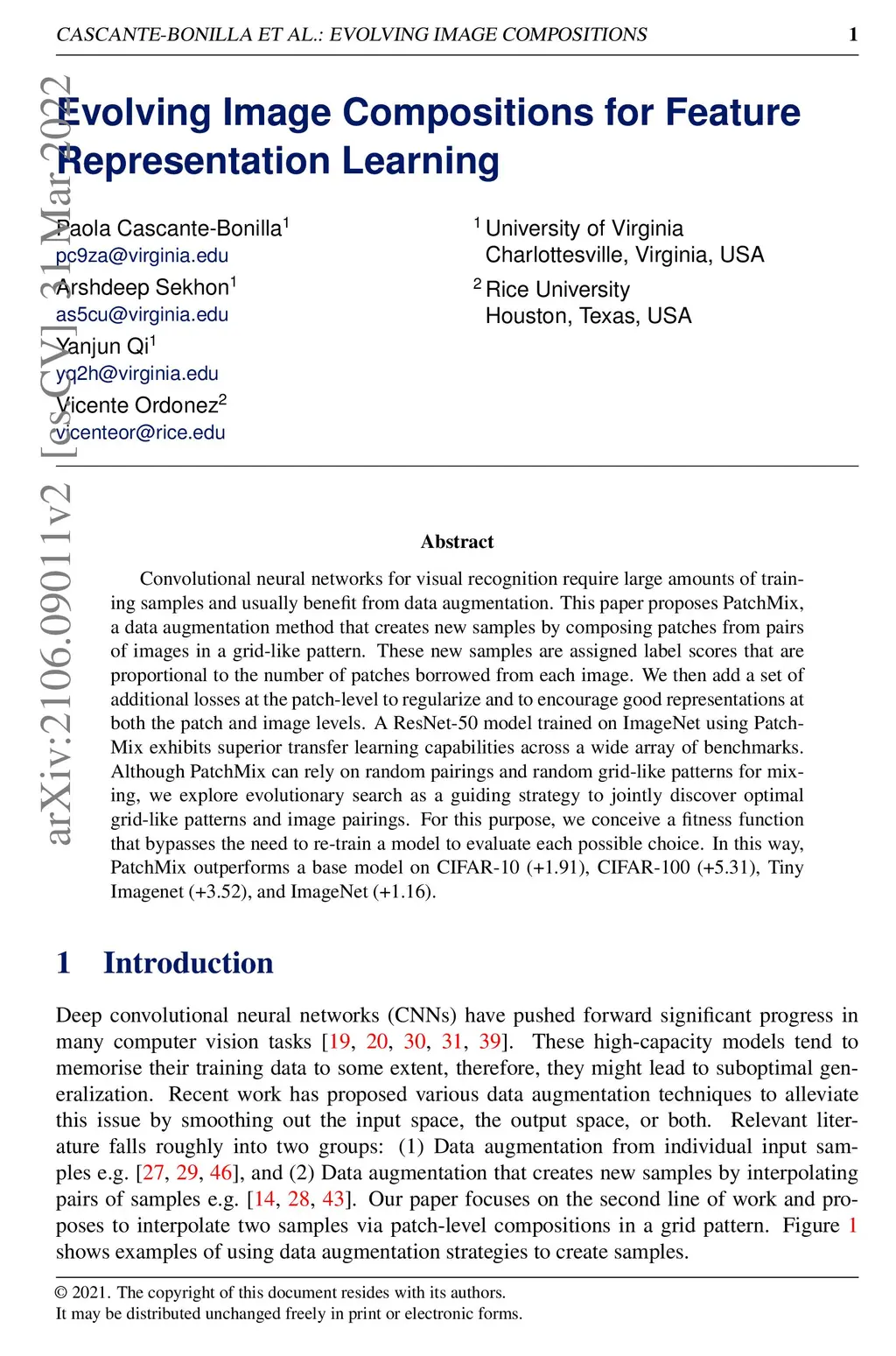 Convolutional neural networks for visual recognition require large amounts of training samples and usually benefit from data augmentation. This paper proposes PatchMix, a data augmentation method that creates new samples by composing patches from pairs of images in a grid-like pattern. These new samples are assigned label scores that are proportional to the number of patches borrowed from each image. We then add a set of additional losses at the patch-level to regularize and to encourage good representations at both the patch and image levels. A ResNet-50 model trained on ImageNet using PatchMix exhibits superior transfer learning capabilities across a wide array of benchmarks. Although PatchMix can rely on random pairings and random grid-like patterns for mixing, we explore evolutionary search as a guiding strategy to jointly discover optimal grid-like patterns and image pairings. For this purpose, we conceive a fitness function that bypasses the need to re-train a model to evaluate each possible choice. In this way, PatchMix outperforms a base model on CIFAR-10 (+1.91), CIFAR-100 (+5.31), Tiny Imagenet (+3.52), and ImageNet (+1.16).
