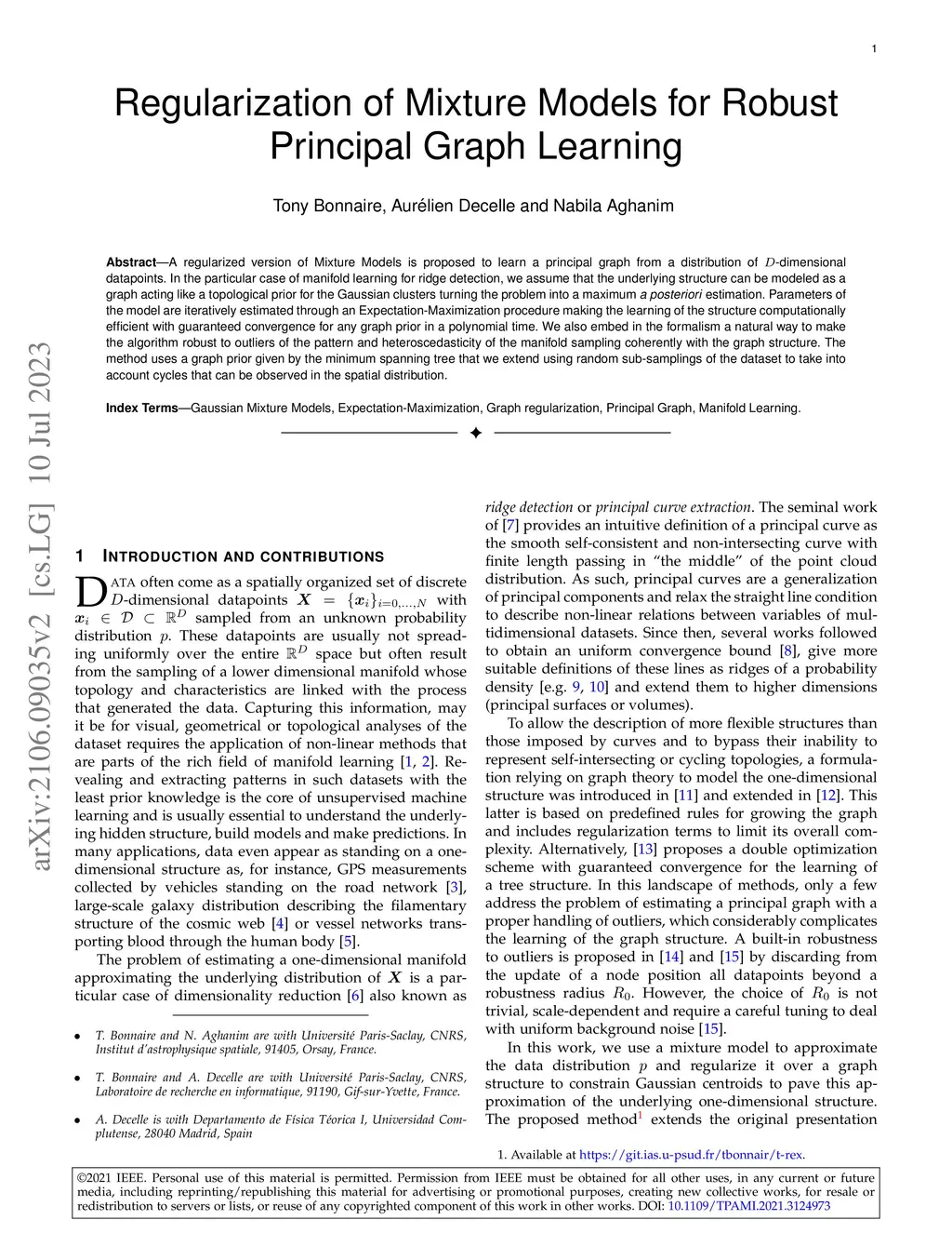 A regularized version of Mixture Models is proposed to learn a principal graph from a distribution of -dimensional data points. In the particular case of manifold learning for ridge detection, we assume that the underlying manifold can be modeled as a graph structure acting like a topological prior for the Gaussian clusters turning the problem into a maximum a posteriori estimation. Parameters of the model are iteratively estimated through an Expectation-Maximization procedure making the learning of the structure computationally efficient with guaranteed convergence for any graph prior in a polynomial time. We also embed in the formalism a natural way to make the algorithm robust to outliers of the pattern and heteroscedasticity of the manifold sampling coherently with the graph structure. The method uses a graph prior given by the minimum spanning tree that we extend using random sub-samplings of the dataset to take into account cycles that can be observed in the spatial distribution.