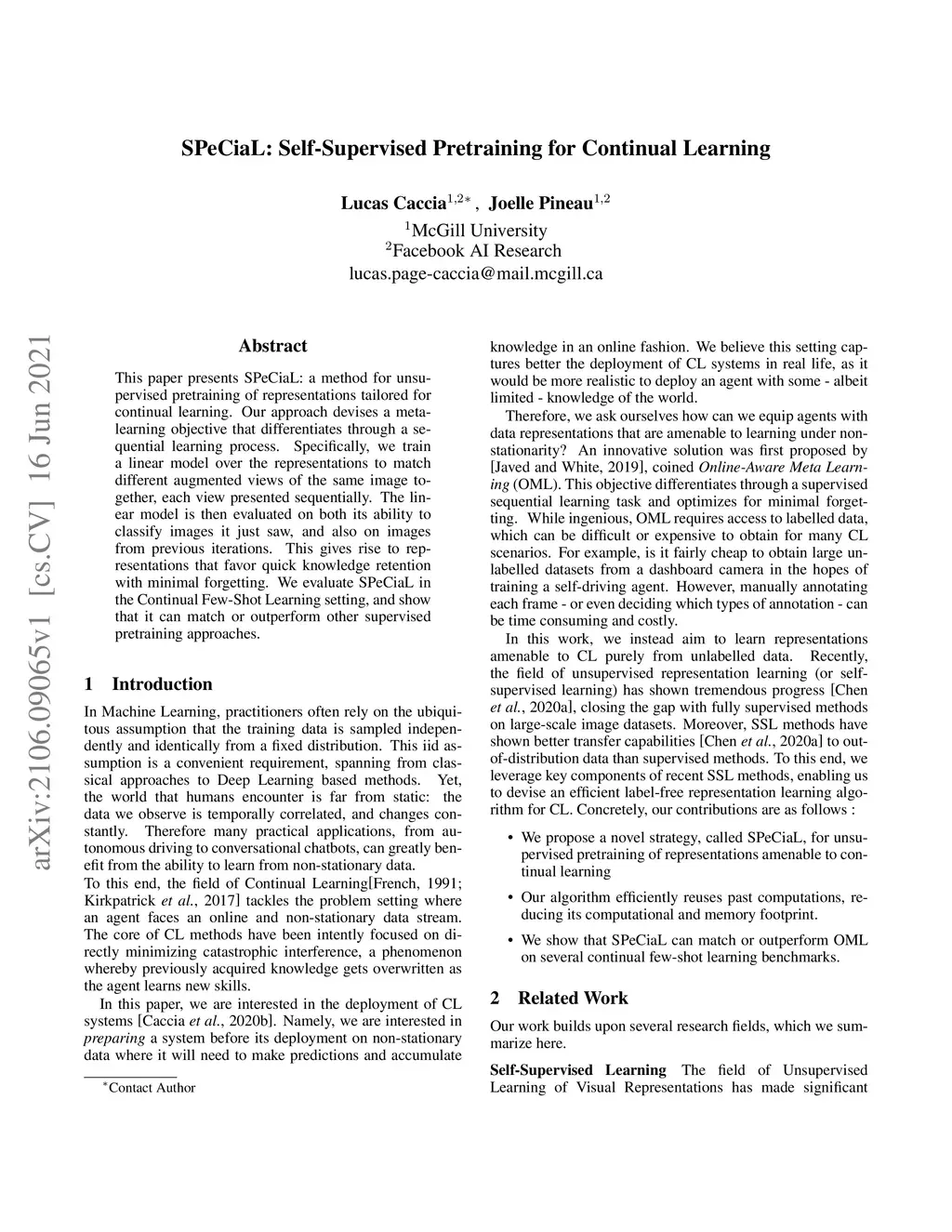 SPeCiaL: Self-Supervised Pretraining for Continual Learning