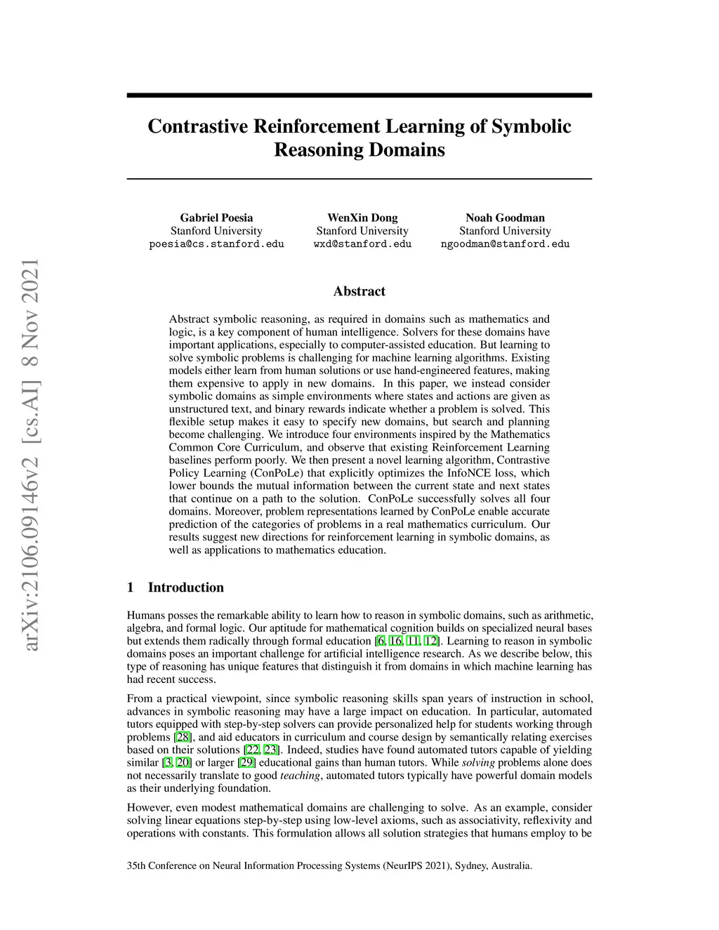 Abstract symbolic reasoning, as required in domains such as mathematics and logic, is a key component of human intelligence. Solvers for these domains have important applications, especially to computer-assisted education. But learning to solve symbolic problems is challenging for machine learning algorithms. Existing models either learn from human solutions or use hand-engineered features, making them expensive to apply in new domains. In this paper, we instead consider symbolic domains as simple environments where states and actions are given as unstructured text, and binary rewards indicate whether a problem is solved. This flexible setup makes it easy to specify new domains, but search and planning become challenging. We introduce four environments inspired by the Mathematics Common Core Curriculum, and observe that existing Reinforcement Learning baselines perform poorly. We then present a novel learning algorithm, Contrastive Policy Learning (ConPoLe) that explicitly optimizes the InfoNCE loss, which lower bounds the mutual information between the current state and next states that continue on a path to the solution. ConPoLe successfully solves all four domains. Moreover, problem representations learned by ConPoLe enable accurate prediction of the categories of problems in a real mathematics curriculum. Our results suggest new directions for reinforcement learning in symbolic domains, as well as applications to mathematics education.