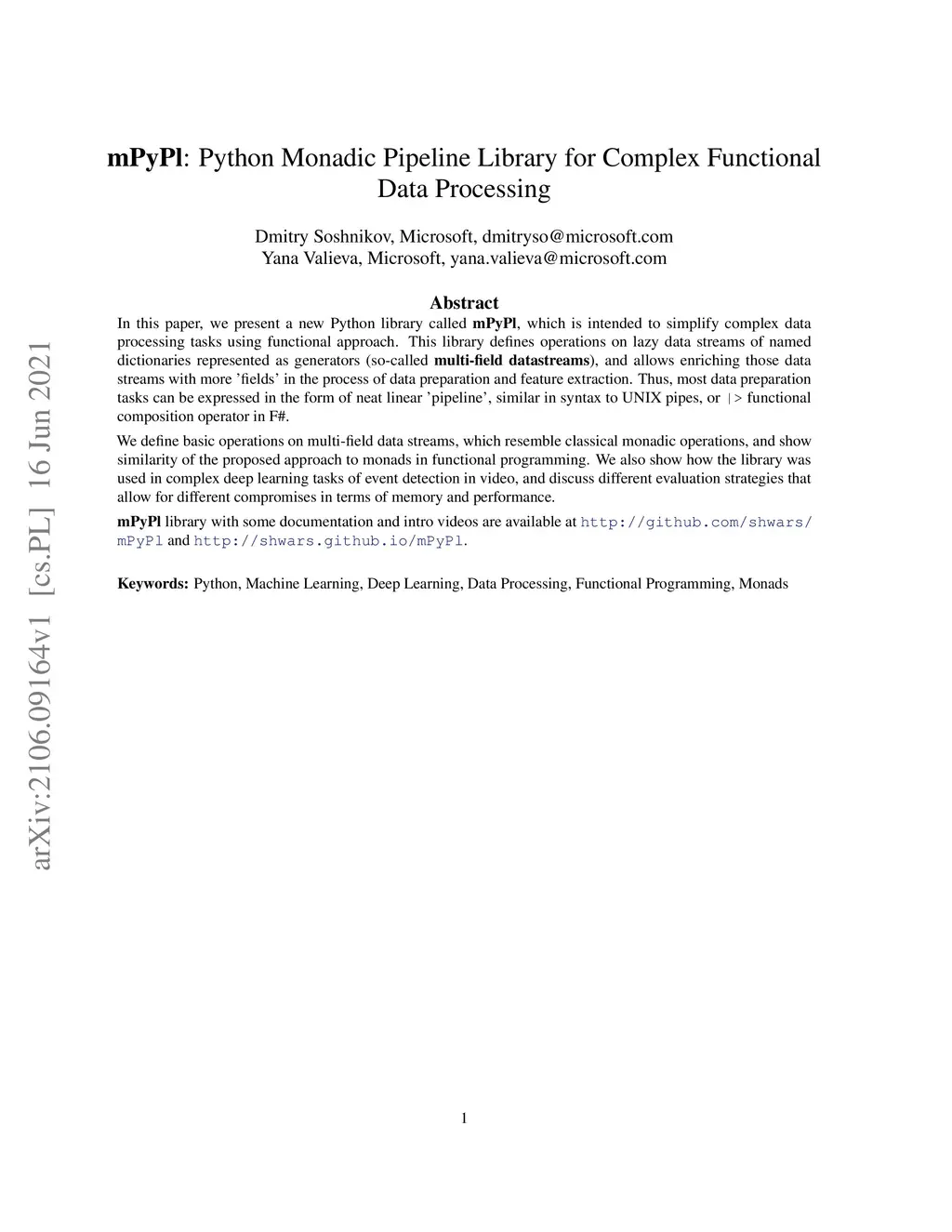 In this paper, we present a new Python library called mPyPl, which is intended to simplify complex data processing tasks using functional approach. This library defines operations on lazy data streams of named dictionaries represented as generators (so-called multi-field datastreams), and allows enriching those data streams with more 'fields' in the process of data preparation and feature extraction. Thus, most data preparation tasks can be expressed in the form of neat linear 'pipeline', similar in syntax to UNIX pipes, or |> functional composition operator in F#. We define basic operations on multi-field data streams, which resemble classical monadic operations, and show similarity of the proposed approach to monads in functional programming. We also show how the library was used in complex deep learning tasks of event detection in video, and discuss different evaluation strategies that allow for different compromises in terms of memory and performance.