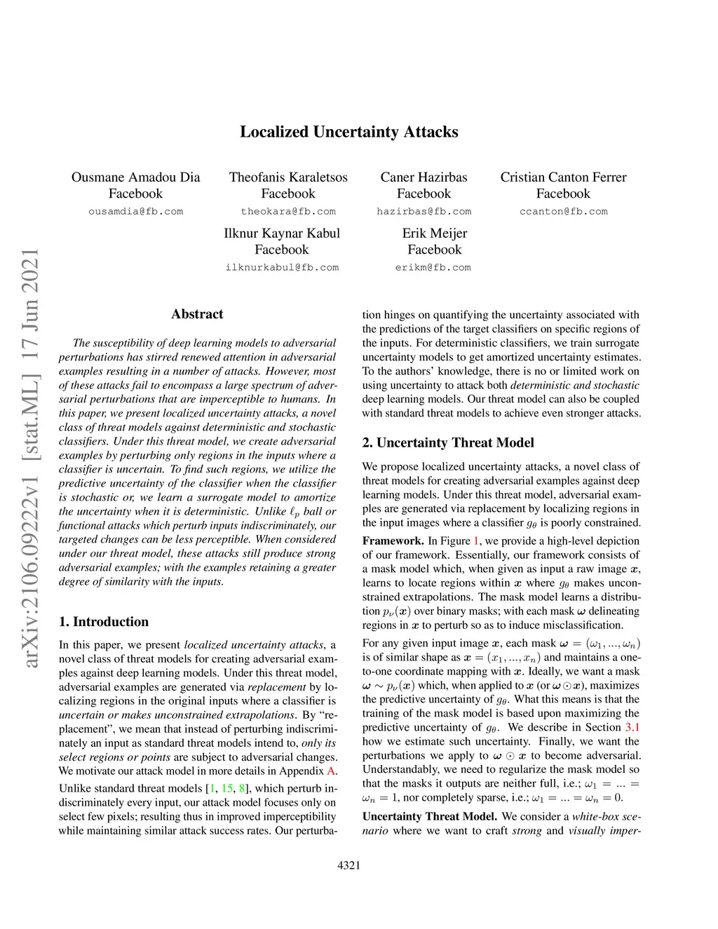 The susceptibility of deep learning models to adversarial perturbations has stirred renewed attention in adversarial examples resulting in a number of attacks. However, most of these attacks fail to encompass a large spectrum of adversarial perturbations that are imperceptible to humans. In this paper, we present localized uncertainty attacks, a novel class of threat models against deterministic and stochastic classifiers. Under this threat model, we create adversarial examples by perturbing only regions in the inputs where a classifier is uncertain. To find such regions, we utilize the predictive uncertainty of the classifier when the classifier is stochastic or, we learn a surrogate model to amortize the uncertainty when it is deterministic. Unlike ball or functional attacks which perturb inputs indiscriminately, our targeted changes can be less perceptible. When considered under our threat model, these attacks still produce strong adversarial examples; with the examples retaining a greater degree of similarity with the inputs.