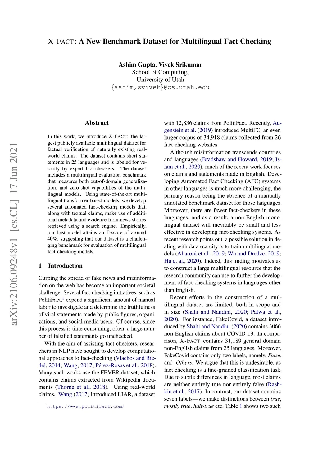 In this work, we introduce X-FACT: the largest publicly available multilingual dataset for factual verification of naturally existing real-world claims. The dataset contains short statements in 25 languages and is labeled for veracity by expert fact-checkers. The dataset includes a multilingual evaluation benchmark that measures both out-of-domain generalization, and zero-shot capabilities of the multilingual models. Using state-of-the-art multilingual transformer-based models, we develop several automated fact-checking models that, along with textual claims, make use of additional metadata and evidence from news stories retrieved using a search engine. Empirically, our best model attains an F-score of around 40%, suggesting that our dataset is a challenging benchmark for evaluation of multilingual fact-checking models.