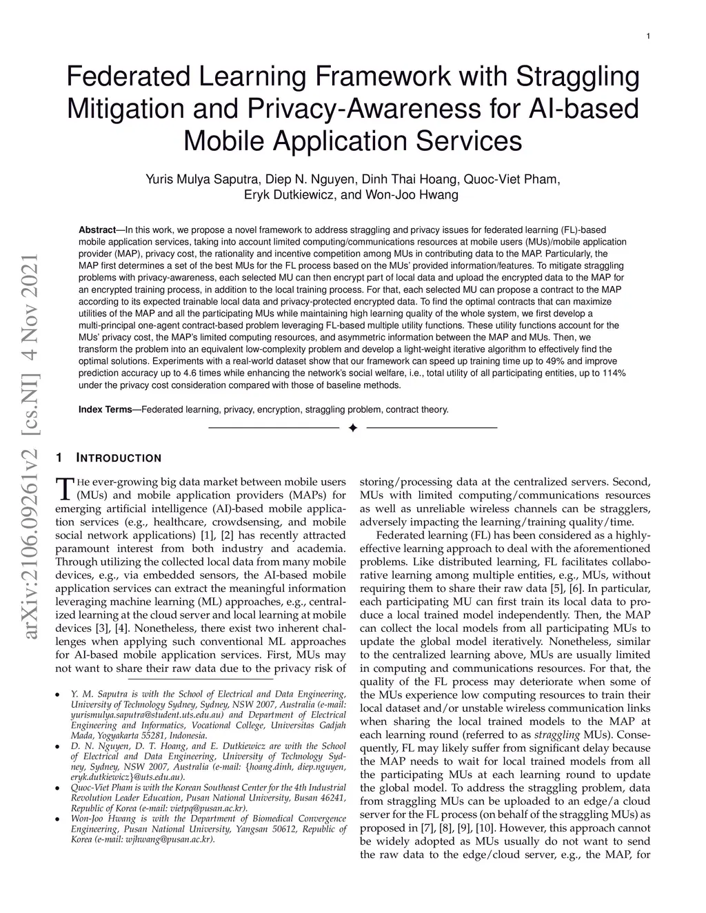 In this work, we propose a novel framework to address straggling and privacy issues for federated learning (FL)-based mobile application services, taking into account limited computing/communications resources at mobile users (MUs)/mobile application provider (MAP), privacy cost, the rationality and incentive competition among MUs in contributing data to the MAP. Particularly, the MAP first determines a set of the best MUs for the FL process based on the MUs' provided information/features. To mitigate straggling problems with privacy-awareness, each selected MU can then encrypt part of local data and upload the encrypted data to the MAP for an encrypted training process, in addition to the local training process. For that, each selected MU can propose a contract to the MAP according to its expected trainable local data and privacy-protected encrypted data. To find the optimal contracts that can maximize utilities of the MAP and all the participating MUs while maintaining high learning quality of the whole system, we first develop a multi-principal one-agent contract-based problem leveraging FL-based multiple utility functions. These utility functions account for the MUs' privacy cost, the MAP's limited computing resources, and asymmetric information between the MAP and MUs. Then, we transform the problem into an equivalent low-complexity problem and develop a light-weight iterative algorithm to effectively find the optimal solutions. Experiments with a real-world dataset show that our framework can speed up training time up to 49% and improve prediction accuracy up to 4.6 times while enhancing the network's social welfare, i.e., total utility of all participating entities, up to 114% under the privacy cost consideration compared with those of baseline methods.