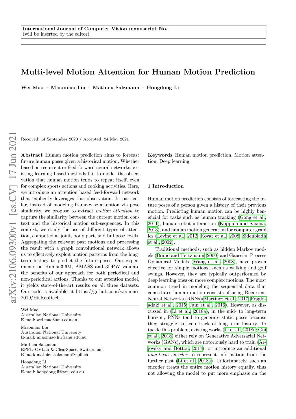 Human motion prediction aims to forecast future human poses given a historical motion. Whether based on recurrent or feed-forward neural networks, existing learning based methods fail to model the observation that human motion tends to repeat itself, even for complex sports actions and cooking activities. Here, we introduce an attention based feed-forward network that explicitly leverages this observation. In particular, instead of modeling frame-wise attention via pose similarity, we propose to extract motion attention to capture the similarity between the current motion context and the historical motion sub-sequences. In this context, we study the use of different types of attention, computed at joint, body part, and full pose levels. Aggregating the relevant past motions and processing the result with a graph convolutional network allows us to effectively exploit motion patterns from the long-term history to predict the future poses. Our experiments on Human3.6M, AMASS and 3DPW validate the benefits of our approach for both periodical and non-periodical actions. Thanks to our attention model, it yields state-of-the-art results on all three datasets. Our code is available at https://github.com/wei-mao-2019/HisRepItself.