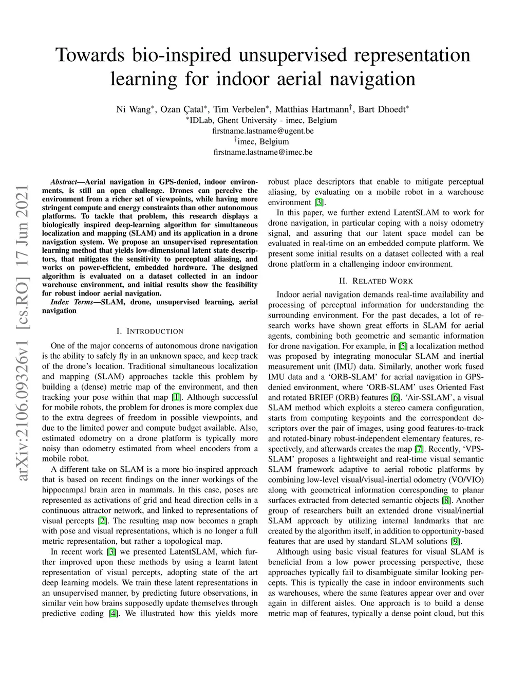Aerial navigation in GPS-denied, indoor environments, is still an open challenge. Drones can perceive the environment from a richer set of viewpoints, while having more stringent compute and energy constraints than other autonomous platforms. To tackle that problem, this research displays a biologically inspired deep-learning algorithm for simultaneous localization and mapping (SLAM) and its application in a drone navigation system. We propose an unsupervised representation learning method that yields low-dimensional latent state descriptors, that mitigates the sensitivity to perceptual aliasing, and works on power-efficient, embedded hardware. The designed algorithm is evaluated on a dataset collected in an indoor warehouse environment, and initial results show the feasibility for robust indoor aerial navigation.