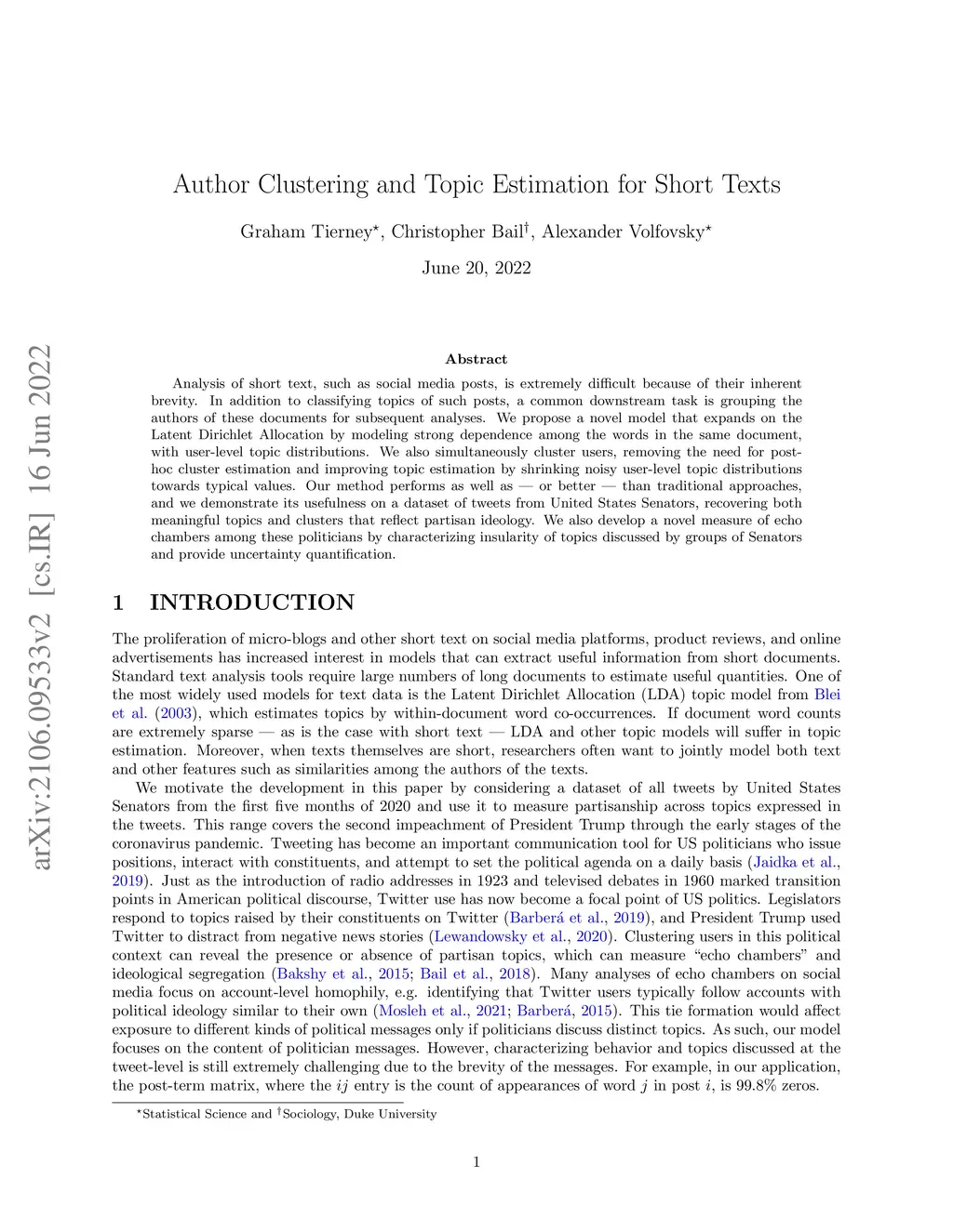 Analysis of short text, such as social media posts, is extremely difficult because of their inherent brevity. In addition to classifying topics of such posts, a common downstream task is grouping the authors of these documents for subsequent analyses. We propose a novel model that expands on the Latent Dirichlet Allocation by modeling strong dependence among the words in the same document, with user-level topic distributions. We also simultaneously cluster users, removing the need for post-hoc cluster estimation and improving topic estimation by shrinking noisy user-level topic distributions towards typical values. Our method performs as well as -- or better -- than traditional approaches, and we demonstrate its usefulness on a dataset of tweets from United States Senators, recovering both meaningful topics and clusters that reflect partisan ideology. We also develop a novel measure of echo chambers among these politicians by characterizing insularity of topics discussed by groups of Senators and provide uncertainty quantification.