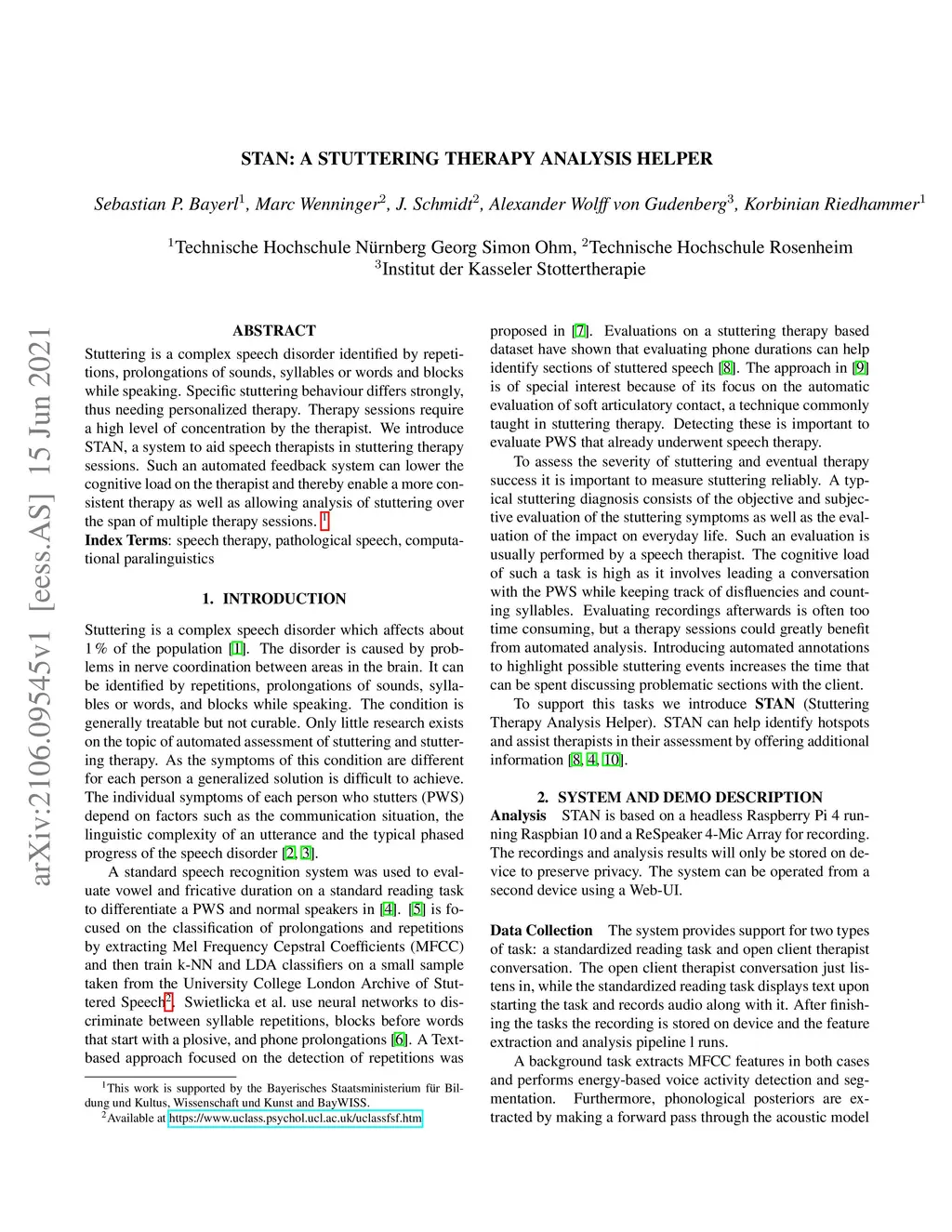 Stuttering is a complex speech disorder identified by repeti-tions, prolongations of sounds, syllables or words and blockswhile speaking. Specific stuttering behaviour differs strongly,thus needing personalized therapy. Therapy sessions requirea high level of concentration by the therapist. We introduceSTAN, a system to aid speech therapists in stuttering therapysessions. Such an automated feedback system can lower thecognitive load on the therapist and thereby enable a more con-sistent therapy as well as allowing analysis of stuttering overthe span of multiple therapy sessions.