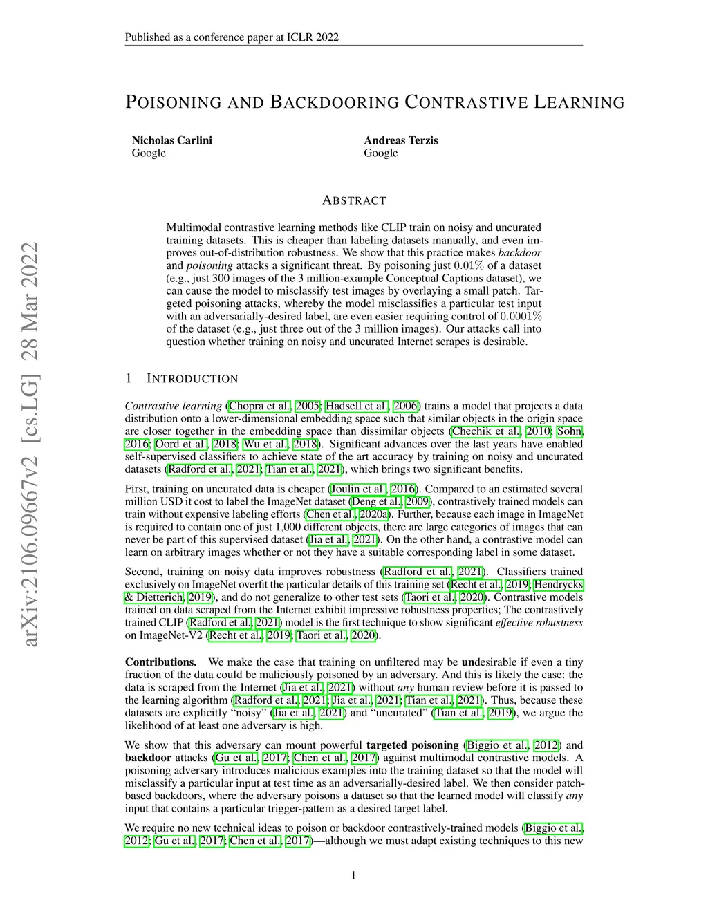 Multimodal contrastive learning methods like CLIP train on noisy and uncurated training datasets. This is cheaper than labeling datasets manually, and even improves out-of-distribution robustness. We show that this practice makes backdoor and poisoning attacks a significant threat. By poisoning just 0.01% of a dataset (e.g., just 300 images of the 3 million-example Conceptual Captions dataset), we can cause the model to misclassify test images by overlaying a small patch. Targeted poisoning attacks, whereby the model misclassifies a particular test input with an adversarially-desired label, are even easier requiring control of 0.0001% of the dataset (e.g., just three out of the 3 million images). Our attacks call into question whether training on noisy and uncurated Internet scrapes is desirable.
