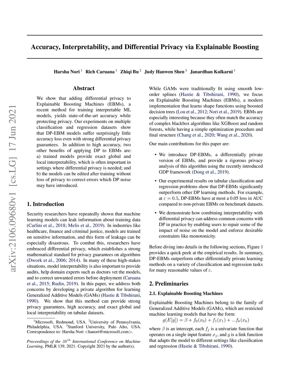 We show that adding differential privacy to Explainable Boosting Machines (EBMs), a recent method for training interpretable ML models, yields state-of-the-art accuracy while protecting privacy. Our experiments on multiple classification and regression datasets show that DP-EBM models suffer surprisingly little accuracy loss even with strong differential privacy guarantees. In addition to high accuracy, two other benefits of applying DP to EBMs are: a) trained models provide exact global and local interpretability, which is often important in settings where differential privacy is needed; and b) the models can be edited after training without loss of privacy to correct errors which DP noise may have introduced.
