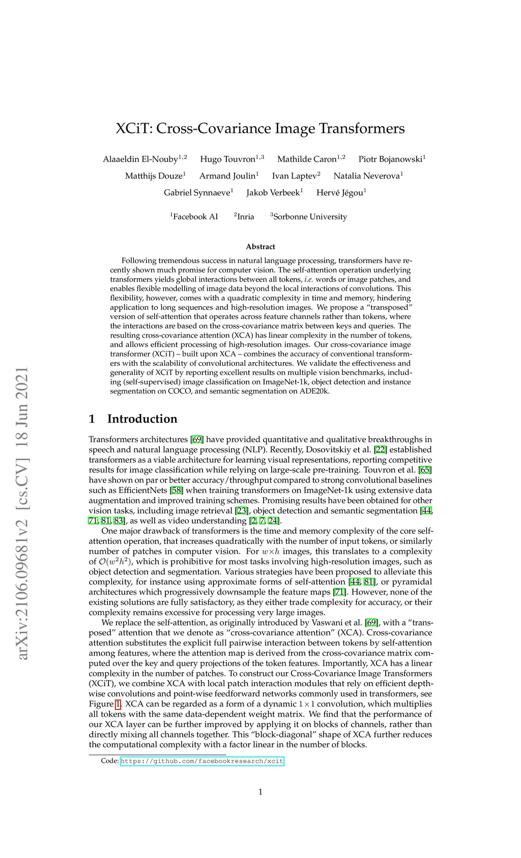 Following their success in natural language processing, transformers have recently shown much promise for computer vision. The self-attention operation underlying transformers yields global interactions between all tokens ,i.e. words or image patches, and enables flexible modelling of image data beyond the local interactions of convolutions. This flexibility, however, comes with a quadratic complexity in time and memory, hindering application to long sequences and high-resolution images. We propose a "transposed" version of self-attention that operates across feature channels rather than tokens, where the interactions are based on the cross-covariance matrix between keys and queries. The resulting cross-covariance attention (XCA) has linear complexity in the number of tokens, and allows efficient processing of high-resolution images. Our cross-covariance image transformer (XCiT) is built upon XCA. It combines the accuracy of conventional transformers with the scalability of convolutional architectures. We validate the effectiveness and generality of XCiT by reporting excellent results on multiple vision benchmarks, including image classification and self-supervised feature learning on ImageNet-1k, object detection and instance segmentation on COCO, and semantic segmentation on ADE20k.