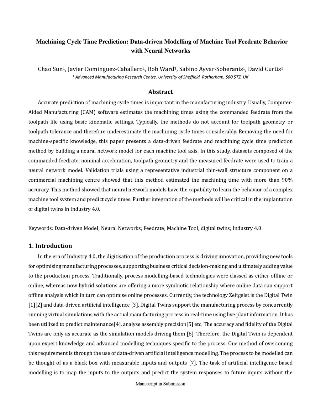 Accurate prediction of machining cycle times is important in the manufacturing industry. Usually, Computer Aided Manufacturing (CAM) software estimates the machining times using the commanded feedrate from the toolpath file using basic kinematic settings. Typically, the methods do not account for toolpath geometry or toolpath tolerance and therefore under estimate the machining cycle times considerably. Removing the need for machine specific knowledge, this paper presents a data-driven feedrate and machining cycle time prediction method by building a neural network model for each machine tool axis. In this study, datasets composed of the commanded feedrate, nominal acceleration, toolpath geometry and the measured feedrate were used to train a neural network model. Validation trials using a representative industrial thin wall structure component on a commercial machining centre showed that this method estimated the machining time with more than 90% accuracy. This method showed that neural network models have the capability to learn the behavior of a complex machine tool system and predict cycle times. Further integration of the methods will be critical in the implantation of digital twins in Industry 4.0.