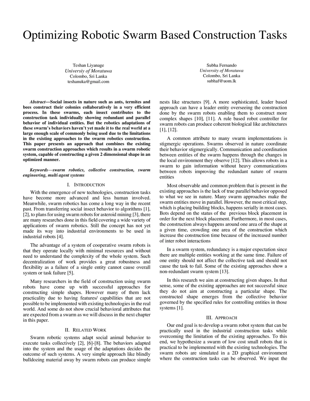 Social insects in nature such as ants, termites and bees construct their colonies collaboratively in a very efficient process. In these swarms, each insect contributes to the construction task individually showing redundant and parallel behavior of individual entities. But the robotics adaptations of these swarm's behaviors haven't yet made it to the real world at a large enough scale of commonly being used due to the limitations in the existing approaches to the swarm robotics construction. This paper presents an approach that combines the existing swarm construction approaches which results in a swarm robotic system, capable of constructing a given 2 dimensional shape in an optimized manner.