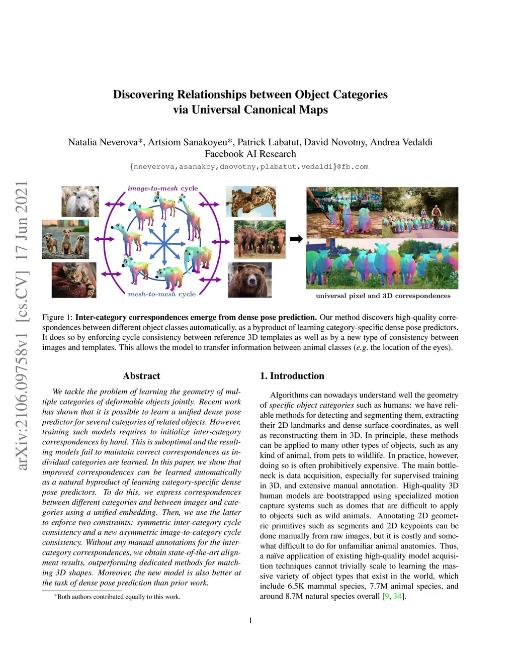 We tackle the problem of learning the geometry of multiple categories of deformable objects jointly. Recent work has shown that it is possible to learn a unified dense pose predictor for several categories of related objects. However, training such models requires to initialize inter-category correspondences by hand. This is suboptimal and the resulting models fail to maintain correct correspondences as individual categories are learned. In this paper, we show that improved correspondences can be learned automatically as a natural byproduct of learning category-specific dense pose predictors. To do this, we express correspondences between different categories and between images and categories using a unified embedding. Then, we use the latter to enforce two constraints: symmetric inter-category cycle consistency and a new asymmetric image-to-category cycle consistency. Without any manual annotations for the inter-category correspondences, we obtain state-of-the-art alignment results, outperforming dedicated methods for matching 3D shapes. Moreover, the new model is also better at the task of dense pose prediction than prior work.
