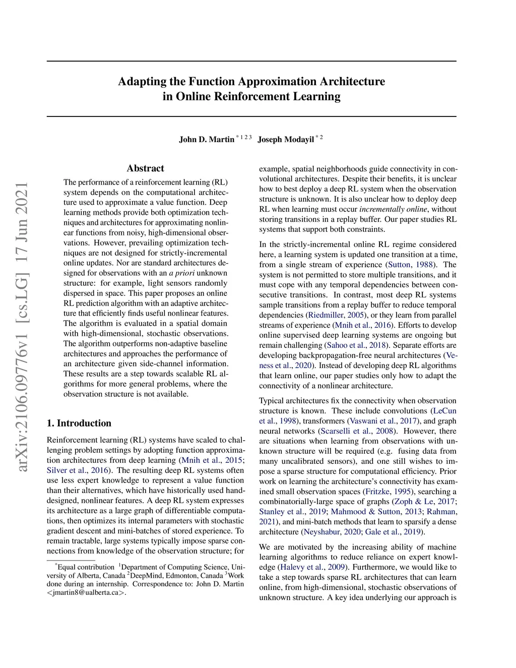 The performance of a reinforcement learning (RL) system depends on the computational architecture used to approximate a value function. Deep learning methods provide both optimization techniques and architectures for approximating nonlinear functions from noisy, high-dimensional observations. However, prevailing optimization techniques are not designed for strictly-incremental online updates. Nor are standard architectures designed for observations with an a priori unknown structure: for example, light sensors randomly dispersed in space. This paper proposes an online RL prediction algorithm with an adaptive architecture that efficiently finds useful nonlinear features. The algorithm is evaluated in a spatial domain with high-dimensional, stochastic observations. The algorithm outperforms non-adaptive baseline architectures and approaches the performance of an architecture given side-channel information. These results are a step towards scalable RL algorithms for more general problems, where the observation structure is not available.