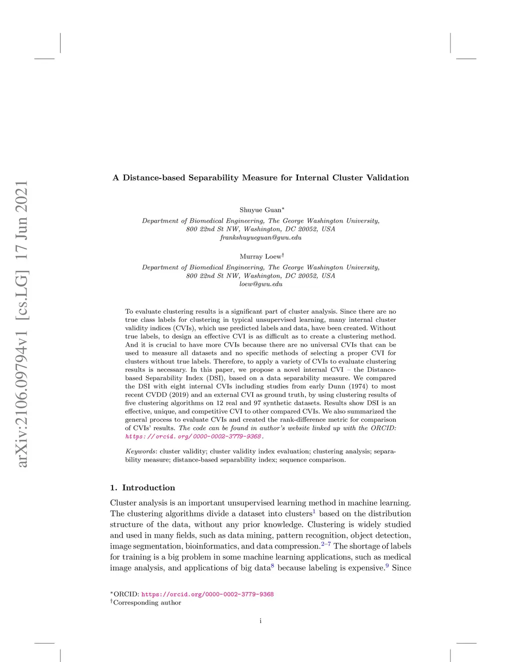To evaluate clustering results is a significant part of cluster analysis. Since there are no true class labels for clustering in typical unsupervised learning, many internal cluster validity indices (CVIs), which use predicted labels and data, have been created. Without true labels, to design an effective CVI is as difficult as to create a clustering method. And it is crucial to have more CVIs because there are no universal CVIs that can be used to measure all datasets and no specific methods of selecting a proper CVI for clusters without true labels. Therefore, to apply a variety of CVIs to evaluate clustering results is necessary. In this paper, we propose a novel internal CVI -- the Distance-based Separability Index (DSI), based on a data separability measure. We compared the DSI with eight internal CVIs including studies from early Dunn (1974) to most recent CVDD (2019) and an external CVI as ground truth, by using clustering results of five clustering algorithms on 12 real and 97 synthetic datasets. Results show DSI is an effective, unique, and competitive CVI to other compared CVIs. We also summarized the general process to evaluate CVIs and created the rank-difference metric for comparison of CVIs' results.