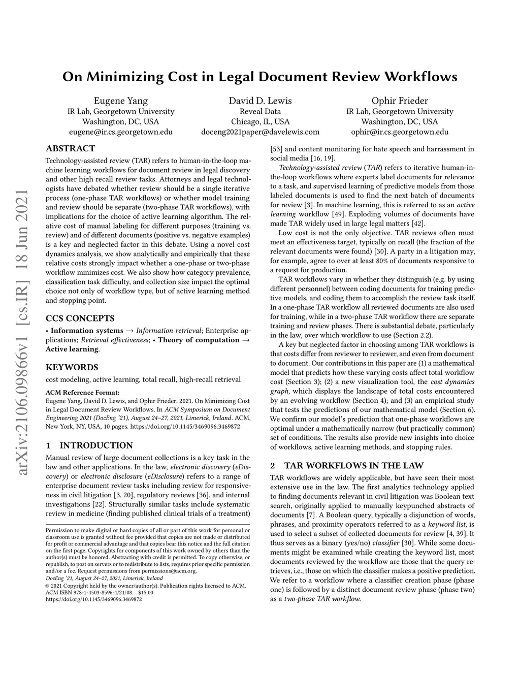 Technology-assisted review (TAR) refers to human-in-the-loop machine learning workflows for document review in legal discovery and other high recall review tasks. Attorneys and legal technologists have debated whether review should be a single iterative process (one-phase TAR workflows) or whether model training and review should be separate (two-phase TAR workflows), with implications for the choice of active learning algorithm. The relative cost of manual labeling for different purposes (training vs. review) and of different documents (positive vs. negative examples) is a key and neglected factor in this debate. Using a novel cost dynamics analysis, we show analytically and empirically that these relative costs strongly impact whether a one-phase or two-phase workflow minimizes cost. We also show how category prevalence, classification task difficulty, and collection size impact the optimal choice not only of workflow type, but of active learning method and stopping point.
