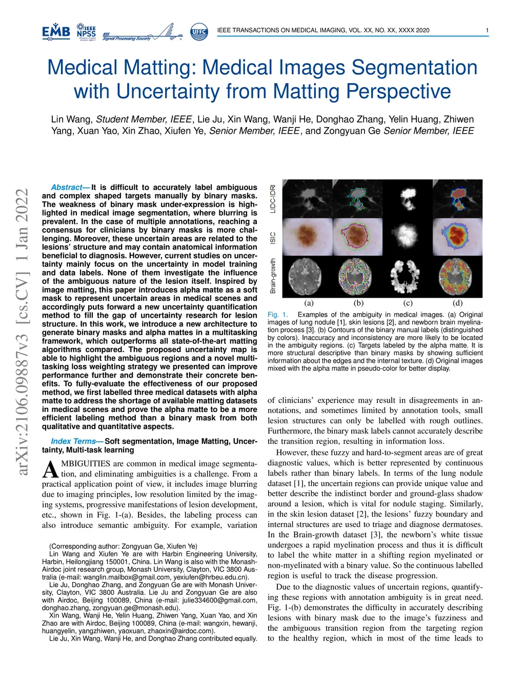 It is difficult to accurately label ambiguous and complex shaped targets manually by binary masks. The weakness of binary mask under-expression is highlighted in medical image segmentation, where blurring is prevalent. In the case of multiple annotations, reaching a consensus for clinicians by binary masks is more challenging. Moreover, these uncertain areas are related to the lesions' structure and may contain anatomical information beneficial to diagnosis. However, current studies on uncertainty mainly focus on the uncertainty in model training and data labels. None of them investigate the influence of the ambiguous nature of the lesion itself.Inspired by image matting, this paper introduces alpha matte as a soft mask to represent uncertain areas in medical scenes and accordingly puts forward a new uncertainty quantification method to fill the gap of uncertainty research for lesion structure. In this work, we introduce a new architecture to generate binary masks and alpha mattes in a multitasking framework, which outperforms all state-of-the-art matting algorithms compared. The proposed uncertainty map is able to highlight the ambiguous regions and a novel multitasking loss weighting strategy we presented can improve performance further and demonstrate their concrete benefits. To fully-evaluate the effectiveness of our proposed method, we first labelled three medical datasets with alpha matte to address the shortage of available matting datasets in medical scenes and prove the alpha matte to be a more efficient labeling method than a binary mask from both qualitative and quantitative aspects.