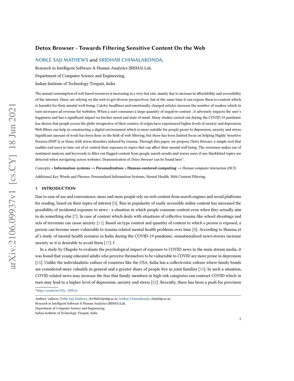 The annual consumption of web-based resources is increasing at a very fast rate, mainly due to an increase in affordability and accessibility of the internet. Many are relying on the web to get diverse perspectives, but at the same time, it can expose them to content that is harmful to their mental well-being. Catchy headlines and emotionally charged articles increase the number of readers which in turn increases ad revenue for websites. When a user consumes a large quantity of negative content, it adversely impacts the user's happiness and has a significant impact on his/her mood and state of mind. Many studies carried out during the COVID-19 pandemic has shown that people across the globe irrespective of their country of origin have experienced higher levels of anxiety and depression. Web filters can help in constructing a digital environment that is more suitable for people prone to depression, anxiety and stress. A significant amount of work has been done in the field of web filtering, but there has been limited focus on helping Highly Sensitive Persons (HSP's) or those with stress disorders induced by trauma. Through this paper, we propose detox Browser, a simple tool that enables end-users to tune out of or control their exposure to topics that can affect their mental well being. The extension makes use of sentiment analysis and keywords to filter out flagged content from google search results and warns users if any blacklisted topics are detected when navigating across websites