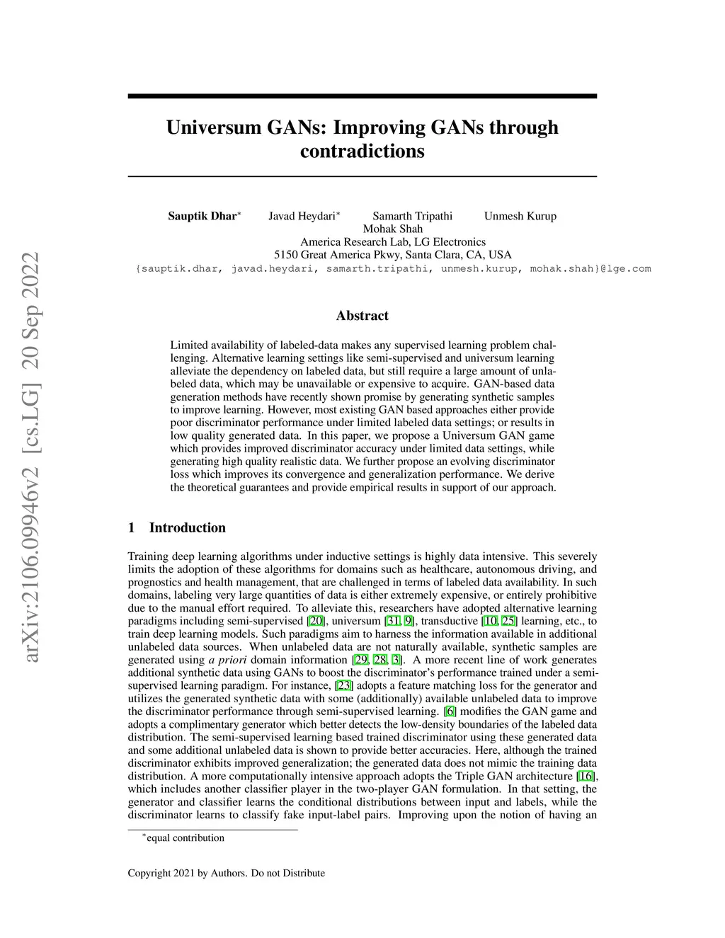 Limited availability of labeled-data makes any supervised learning problem challenging. Alternative learning settings like semi-supervised and universum learning alleviate the dependency on labeled data, but still require a large amount of unlabeled data, which may be unavailable or expensive to acquire. GAN-based synthetic data generation methods have recently shown promise by generating synthetic samples to improve task at hand. However, these samples cannot be used for other purposes. In this paper, we propose a GAN game which provides improved discriminator accuracy under limited data settings, while generating realistic synthetic data. This provides the added advantage that now the generated data can be used for other similar tasks. We provide the theoretical guarantees and empirical results in support of our approach.