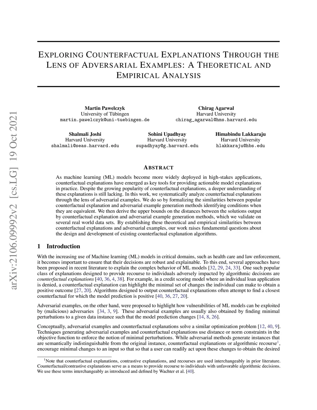 As machine learning (ML) models become more widely deployed in high-stakes applications, counterfactual explanations have emerged as key tools for providing actionable model explanations in practice. Despite the growing popularity of counterfactual explanations, a deeper understanding of these explanations is still lacking. In this work, we systematically analyze counterfactual explanations through the lens of adversarial examples. We do so by formalizing the similarities between popular counterfactual explanation and adversarial example generation methods identifying conditions when they are equivalent. We then derive the upper bounds on the distances between the solutions output by counterfactual explanation and adversarial example generation methods, which we validate on several real-world data sets. By establishing these theoretical and empirical similarities between counterfactual explanations and adversarial examples, our work raises fundamental questions about the design and development of existing counterfactual explanation algorithms.
