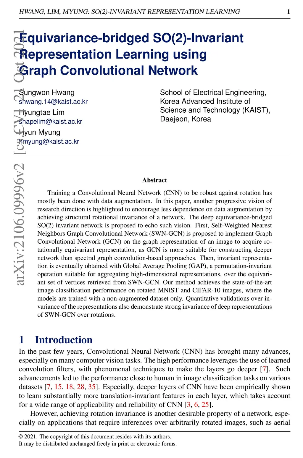 Training a Convolutional Neural Network (CNN) to be robust against rotation has mostly been done with data augmentation. In this paper, another progressive vision of research direction is highlighted to encourage less dependence on data augmentation by achieving structural rotational invariance of a network. The deep equivariance-bridged SO(2) invariant network is proposed to echo such vision. First, Self-Weighted Nearest Neighbors Graph Convolutional Network (SWN-GCN) is proposed to implement Graph Convolutional Network (GCN) on the graph representation of an image to acquire rotationally equivariant representation, as GCN is more suitable for constructing deeper network than spectral graph convolution-based approaches. Then, invariant representation is eventually obtained with Global Average Pooling (GAP), a permutation-invariant operation suitable for aggregating high-dimensional representations, over the equivariant set of vertices retrieved from SWN-GCN. Our method achieves the state-of-the-art image classification performance on rotated MNIST and CIFAR-10 images, where the models are trained with a non-augmented dataset only. Quantitative validations over invariance of the representations also demonstrate strong invariance of deep representations of SWN-GCN over rotations.