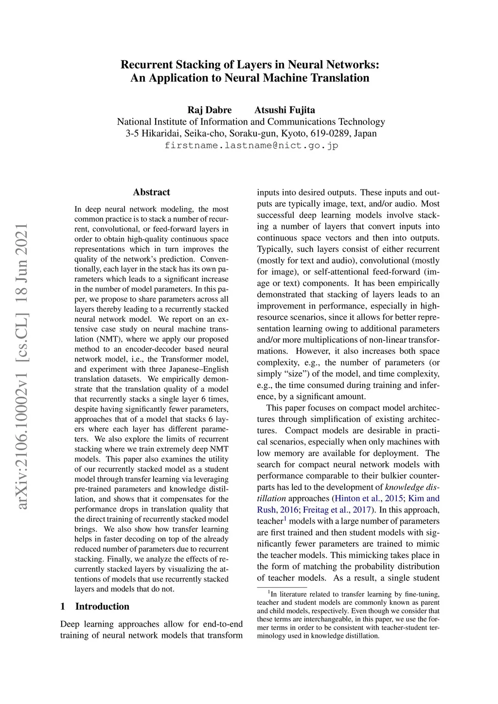 In deep neural network modeling, the most common practice is to stack a number of recurrent, convolutional, or feed-forward layers in order to obtain high-quality continuous space representations which in turn improves the quality of the network's prediction. Conventionally, each layer in the stack has its own parameters which leads to a significant increase in the number of model parameters. In this paper, we propose to share parameters across all layers thereby leading to a recurrently stacked neural network model. We report on an extensive case study on neural machine translation (NMT), where we apply our proposed method to an encoder-decoder based neural network model, i.e., the Transformer model, and experiment with three Japanese--English translation datasets. We empirically demonstrate that the translation quality of a model that recurrently stacks a single layer 6 times, despite having significantly fewer parameters, approaches that of a model that stacks 6 layers where each layer has different parameters. We also explore the limits of recurrent stacking where we train extremely deep NMT models. This paper also examines the utility of our recurrently stacked model as a student model through transfer learning via leveraging pre-trained parameters and knowledge distillation, and shows that it compensates for the performance drops in translation quality that the direct training of recurrently stacked model brings. We also show how transfer learning helps in faster decoding on top of the already reduced number of parameters due to recurrent stacking. Finally, we analyze the effects of recurrently stacked layers by visualizing the attentions of models that use recurrently stacked layers and models that do not.