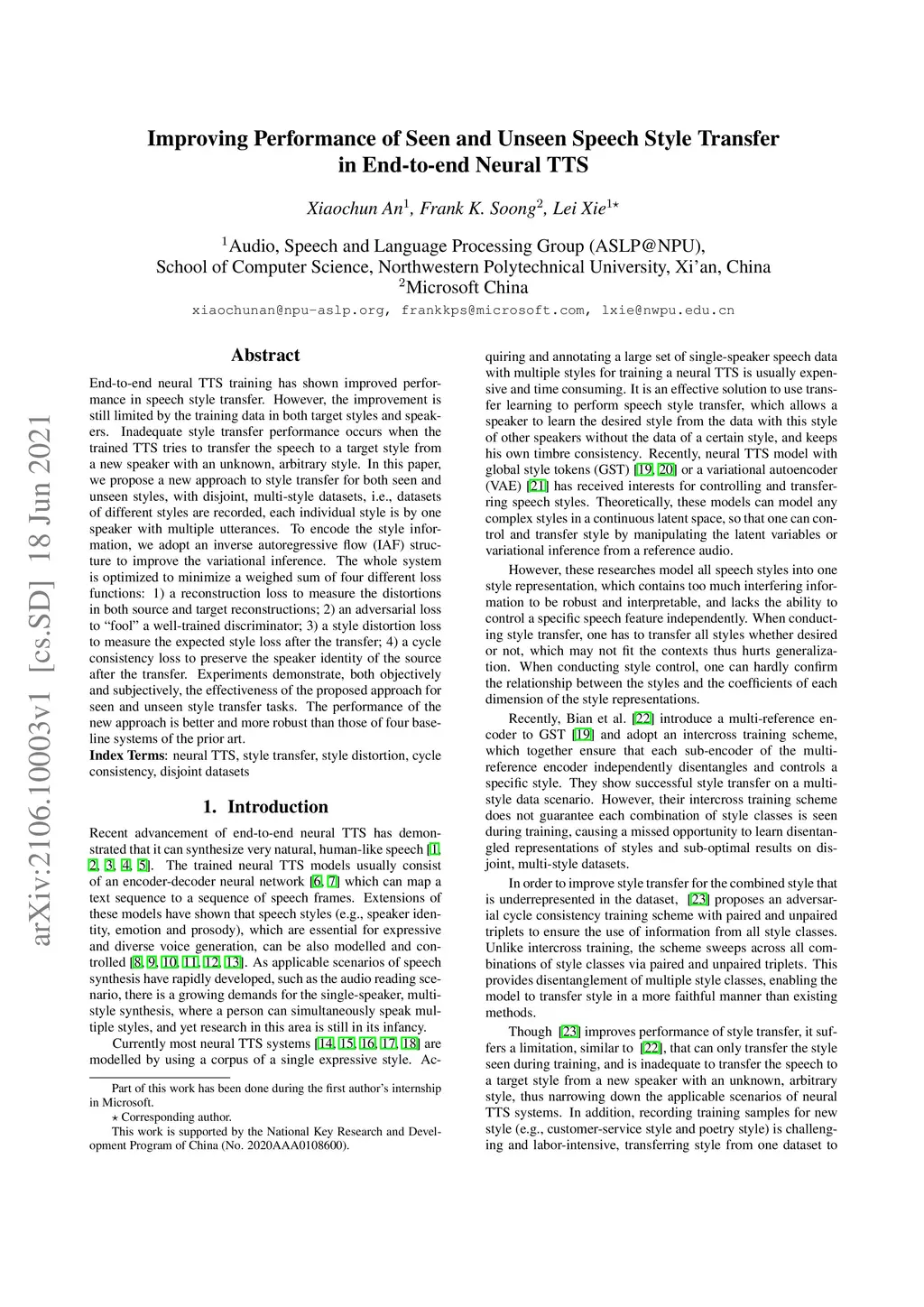 End-to-end neural TTS training has shown improved performance in speech style transfer. However, the improvement is still limited by the training data in both target styles and speakers. Inadequate style transfer performance occurs when the trained TTS tries to transfer the speech to a target style from a new speaker with an unknown, arbitrary style. In this paper, we propose a new approach to style transfer for both seen and unseen styles, with disjoint, multi-style datasets, i.e., datasets of different styles are recorded, each individual style is by one speaker with multiple utterances. To encode the style information, we adopt an inverse autoregressive flow (IAF) structure to improve the variational inference. The whole system is optimized to minimize a weighed sum of four different loss functions: 1) a reconstruction loss to measure the distortions in both source and target reconstructions; 2) an adversarial loss to "fool" a well-trained discriminator; 3) a style distortion loss to measure the expected style loss after the transfer; 4) a cycle consistency loss to preserve the speaker identity of the source after the transfer. Experiments demonstrate, both objectively and subjectively, the effectiveness of the proposed approach for seen and unseen style transfer tasks. The performance of the new approach is better and more robust than those of four baseline systems of the prior art.