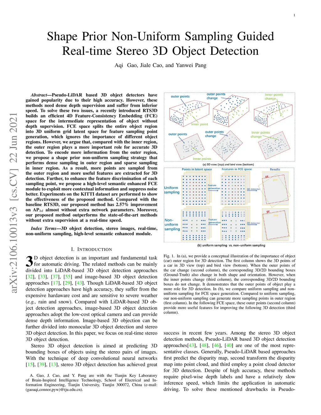Pseudo-LiDAR based 3D object detectors have gained popularity due to their high accuracy. However, these methods need dense depth supervision and suffer from inferior speed. To solve these two issues, a recently introduced RTS3D builds an efficient 4D Feature-Consistency Embedding (FCE) space for the intermediate representation of object without depth supervision. FCE space splits the entire object region into 3D uniform grid latent space for feature sampling point generation, which ignores the importance of different object regions. However, we argue that, compared with the inner region, the outer region plays a more important role for accurate 3D detection. To encode more information from the outer region, we propose a shape prior non-uniform sampling strategy that performs dense sampling in outer region and sparse sampling in inner region. As a result, more points are sampled from the outer region and more useful features are extracted for 3D detection. Further, to enhance the feature discrimination of each sampling point, we propose a high-level semantic enhanced FCE module to exploit more contextual information and suppress noise better. Experiments on the KITTI dataset are performed to show the effectiveness of the proposed method. Compared with the baseline RTS3D, our proposed method has 2.57% improvement on AP3d almost without extra network parameters. Moreover, our proposed method outperforms the state-of-the-art methods without extra supervision at a real-time speed.